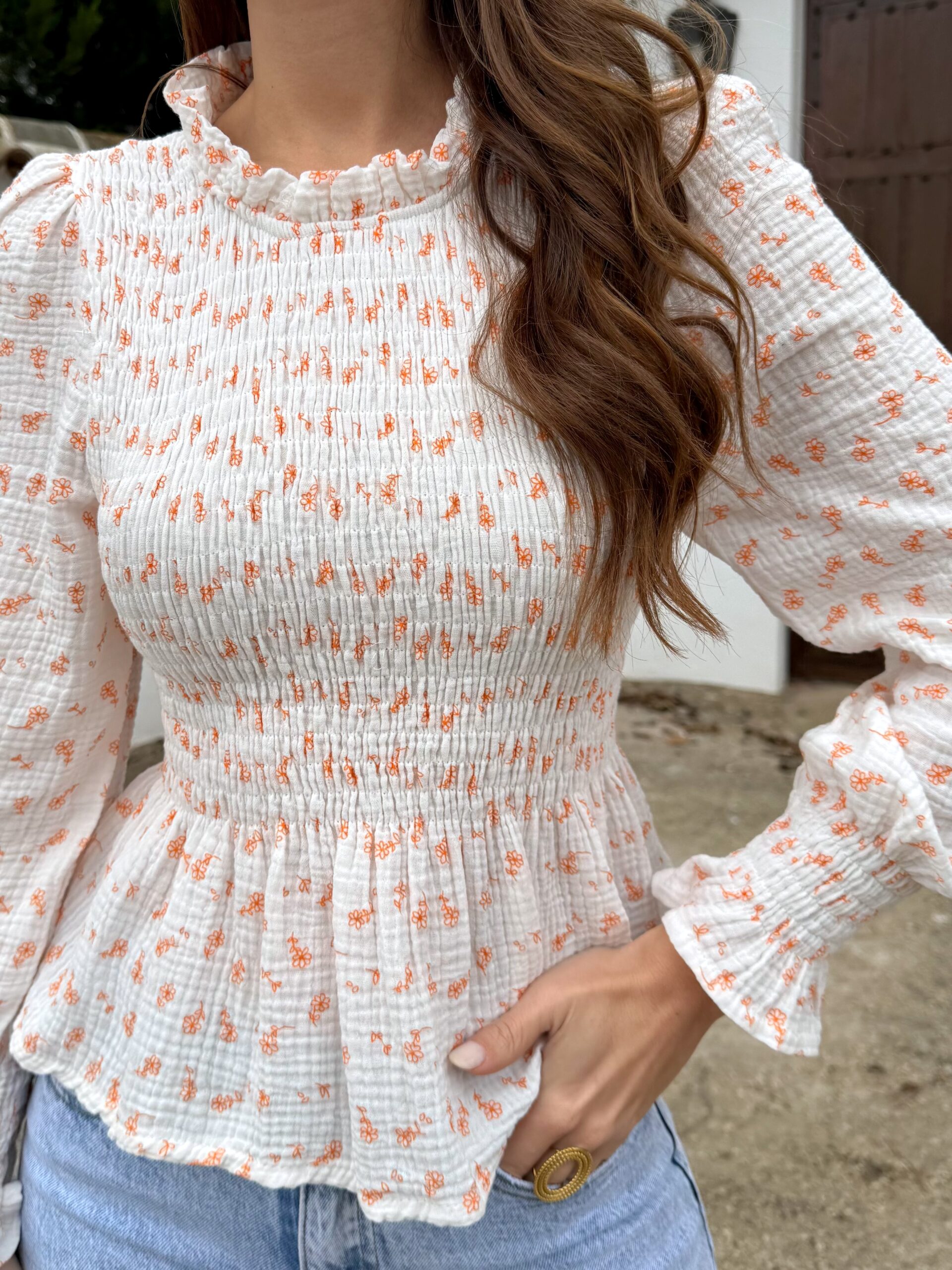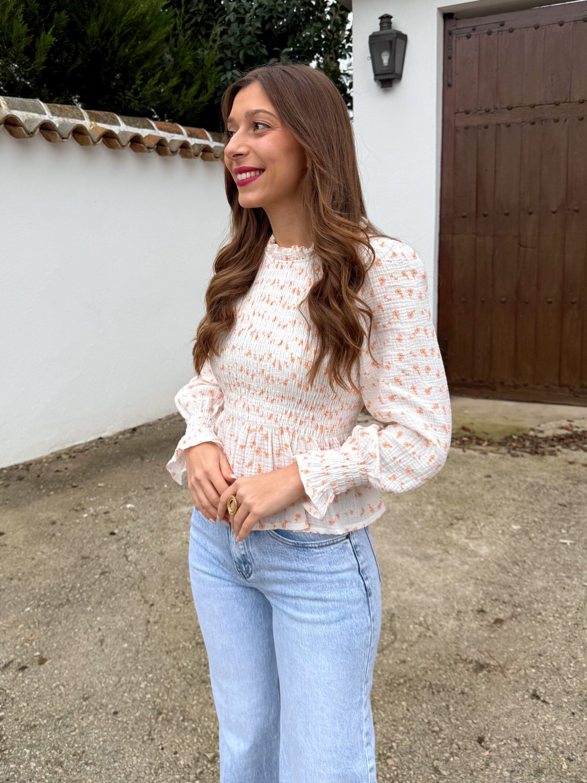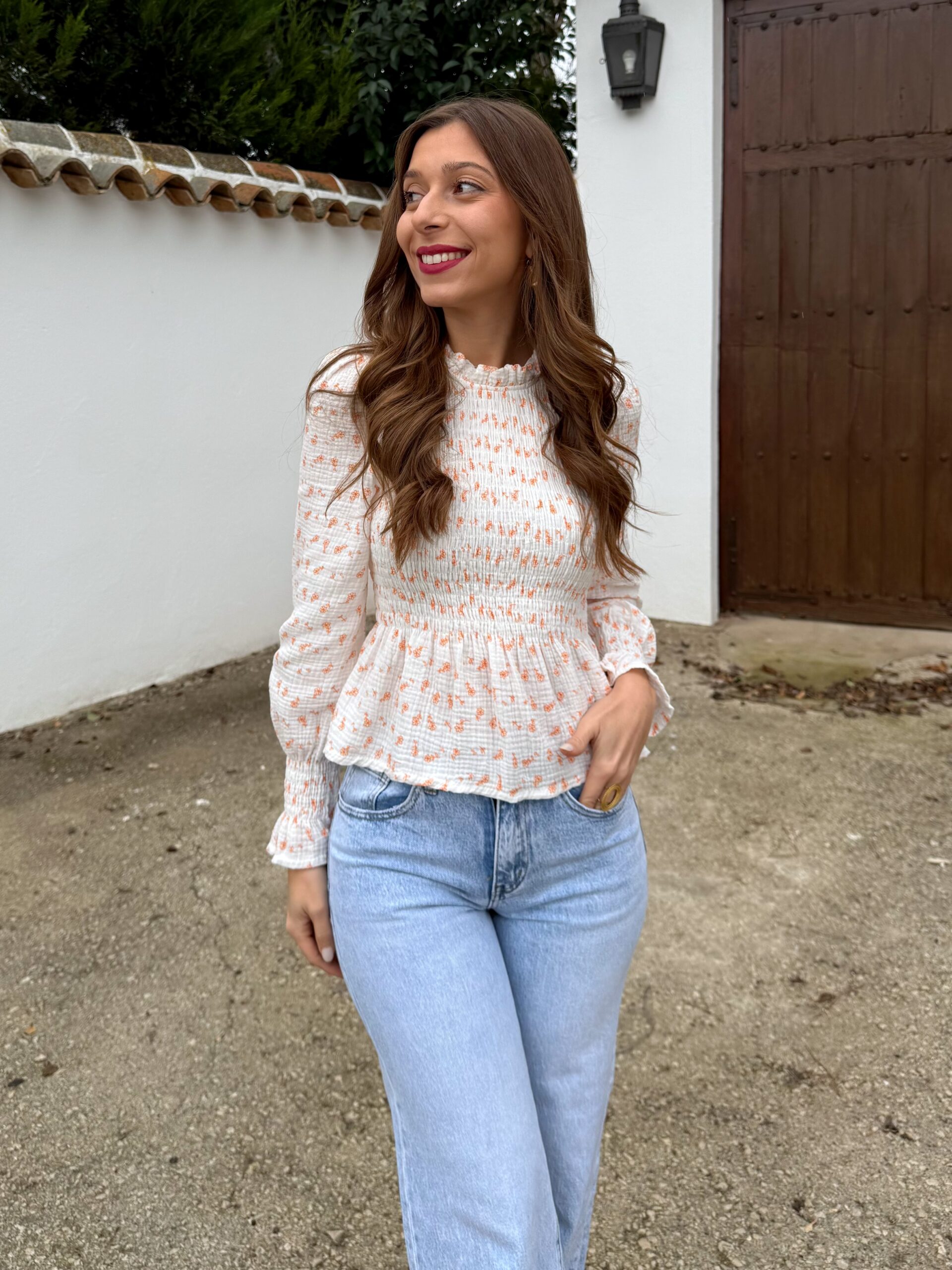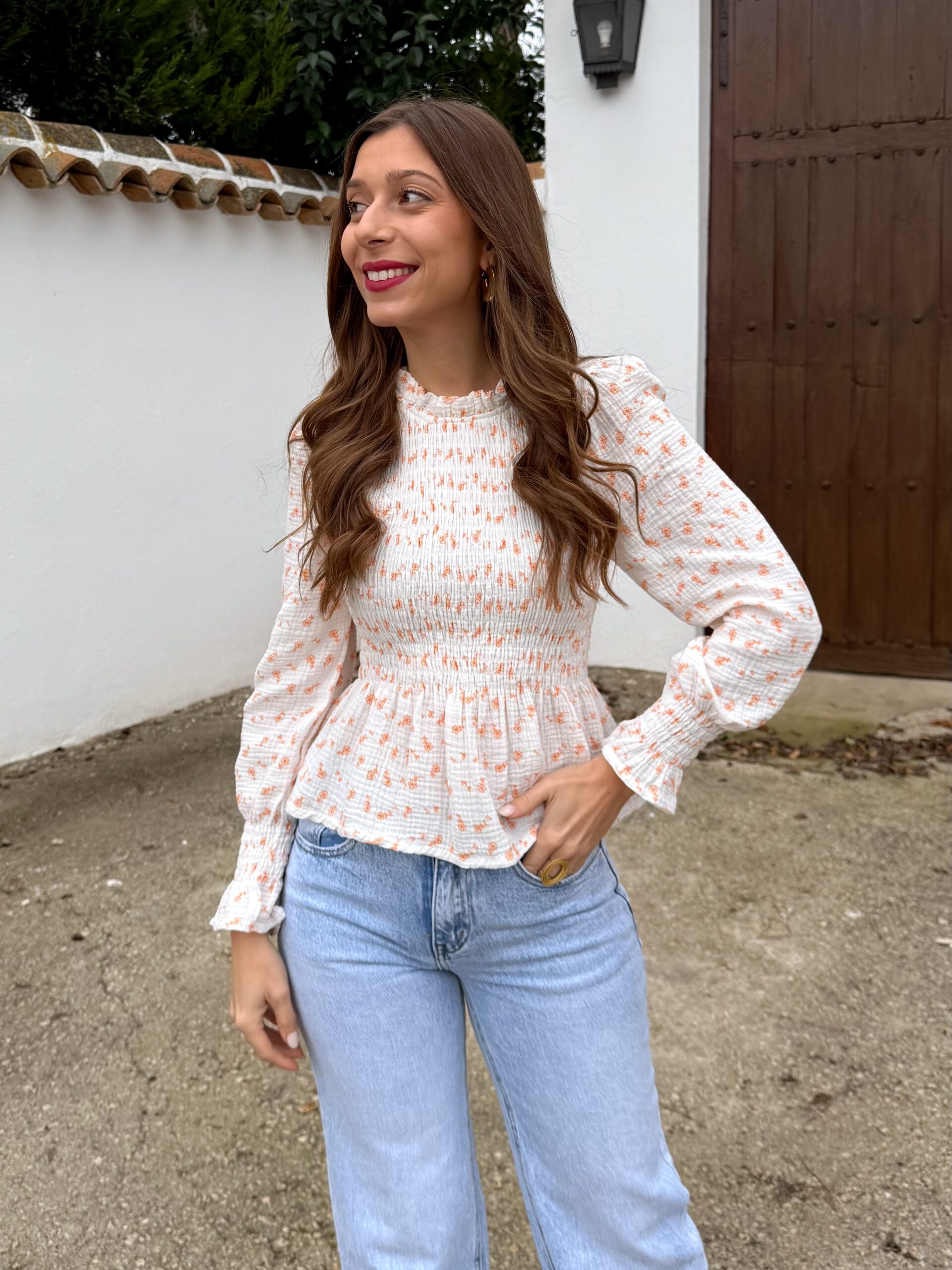Blusa blanca con delicado nido de abeja, adornada con un estampado de flores pequeñitas en tonos de color que aportan un aire fresco y romántico. Su diseño combina comodidad y feminidad, convirtiéndola en una prenda ideal para el día a día o para looks suaves y primaverales.