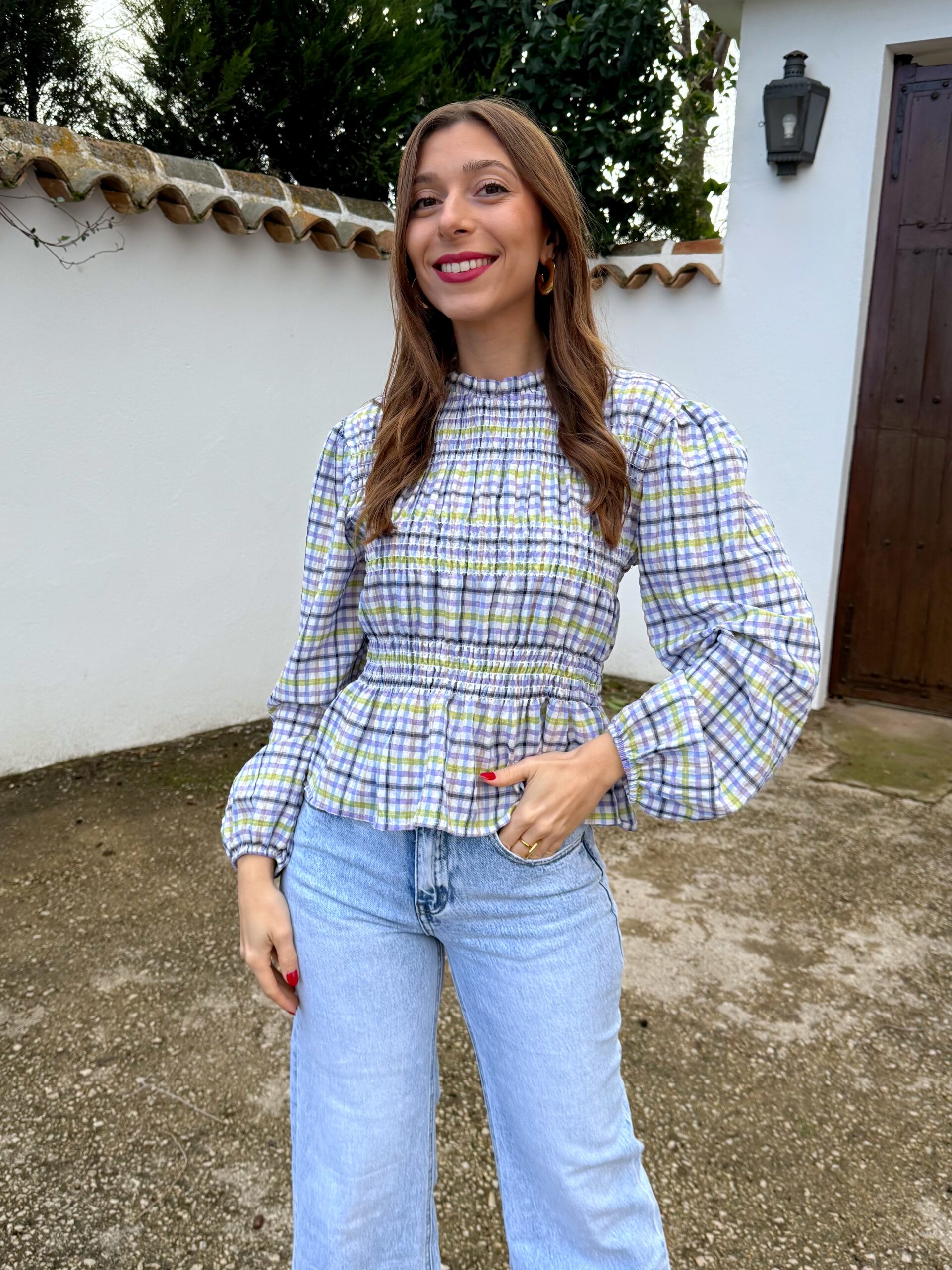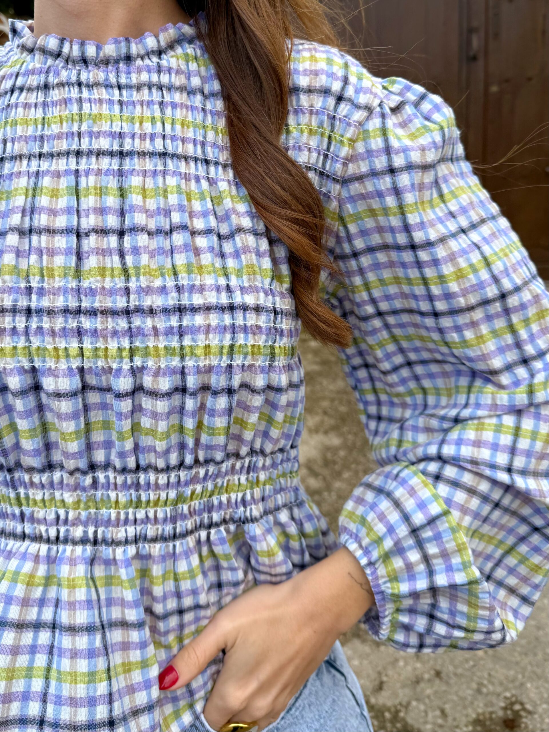 Blusa de estilo romántico con estampado de cuadros en tonos suaves. Diseño con cuello ligeramente subido y cuerpo fruncido con paneles elásticos que se adaptan cómodamente a la silueta, realzando la figura sin oprimir. Manga larga con volumen y puño elástico para un acabado delicado y femenino.
