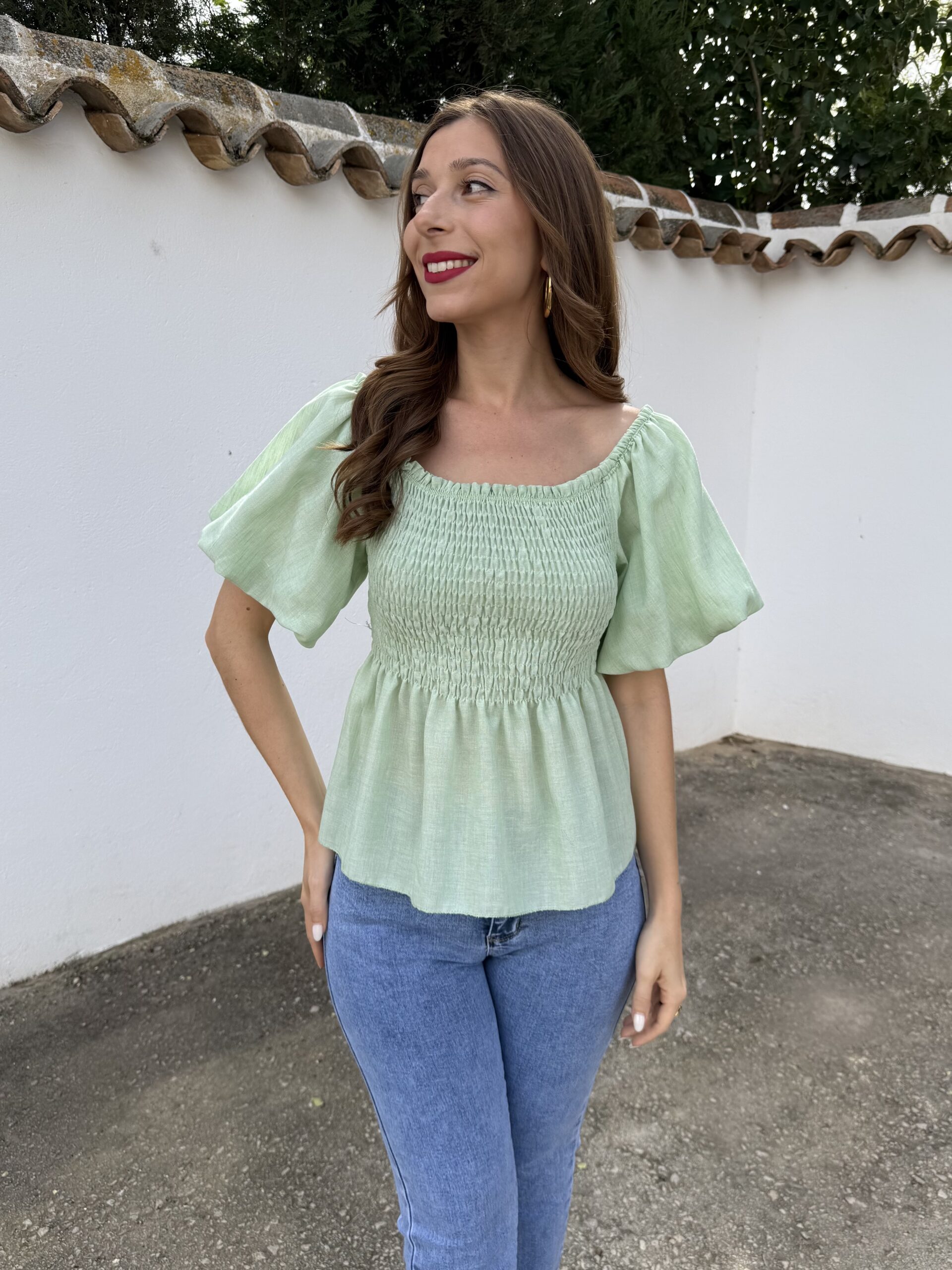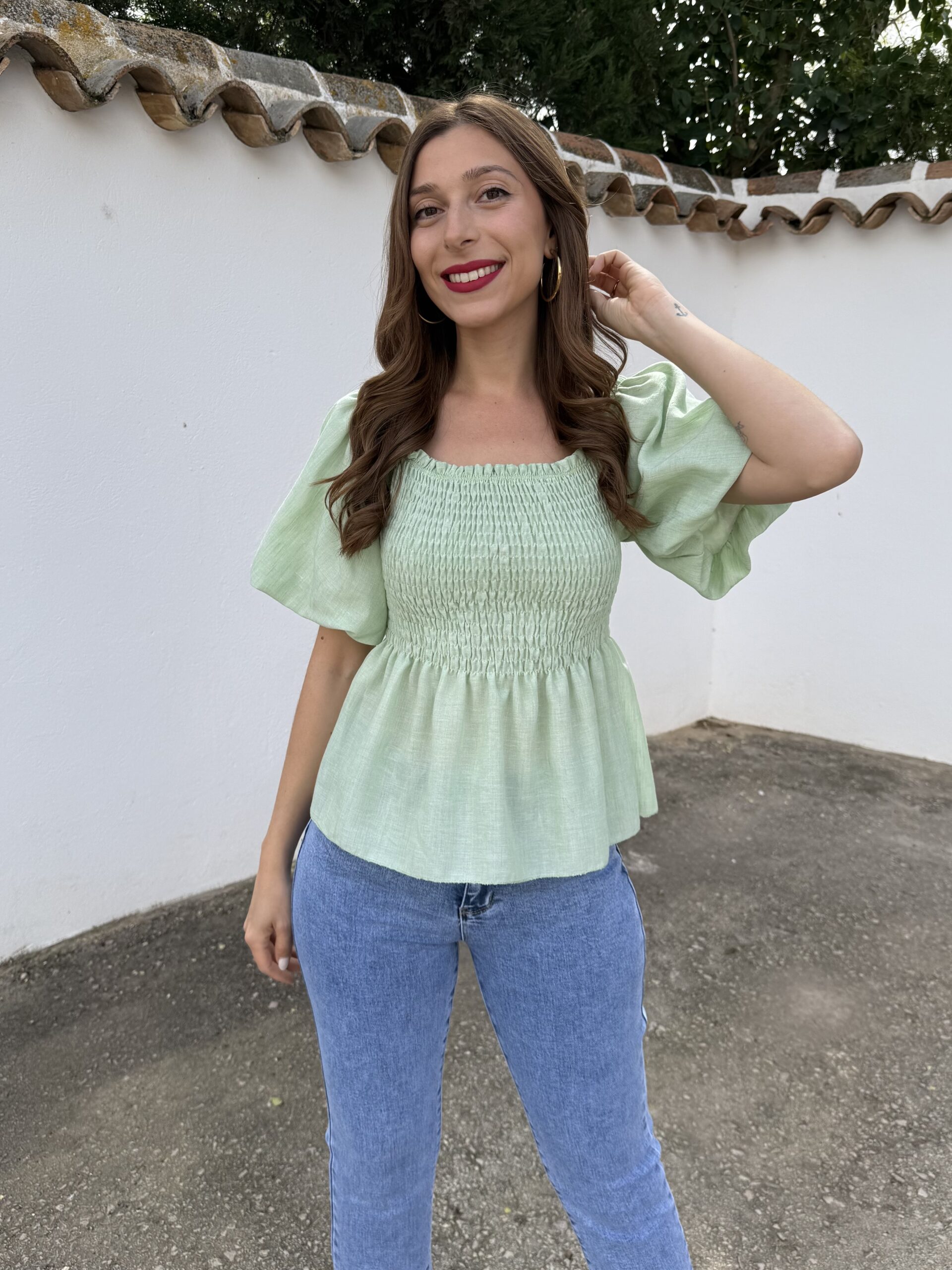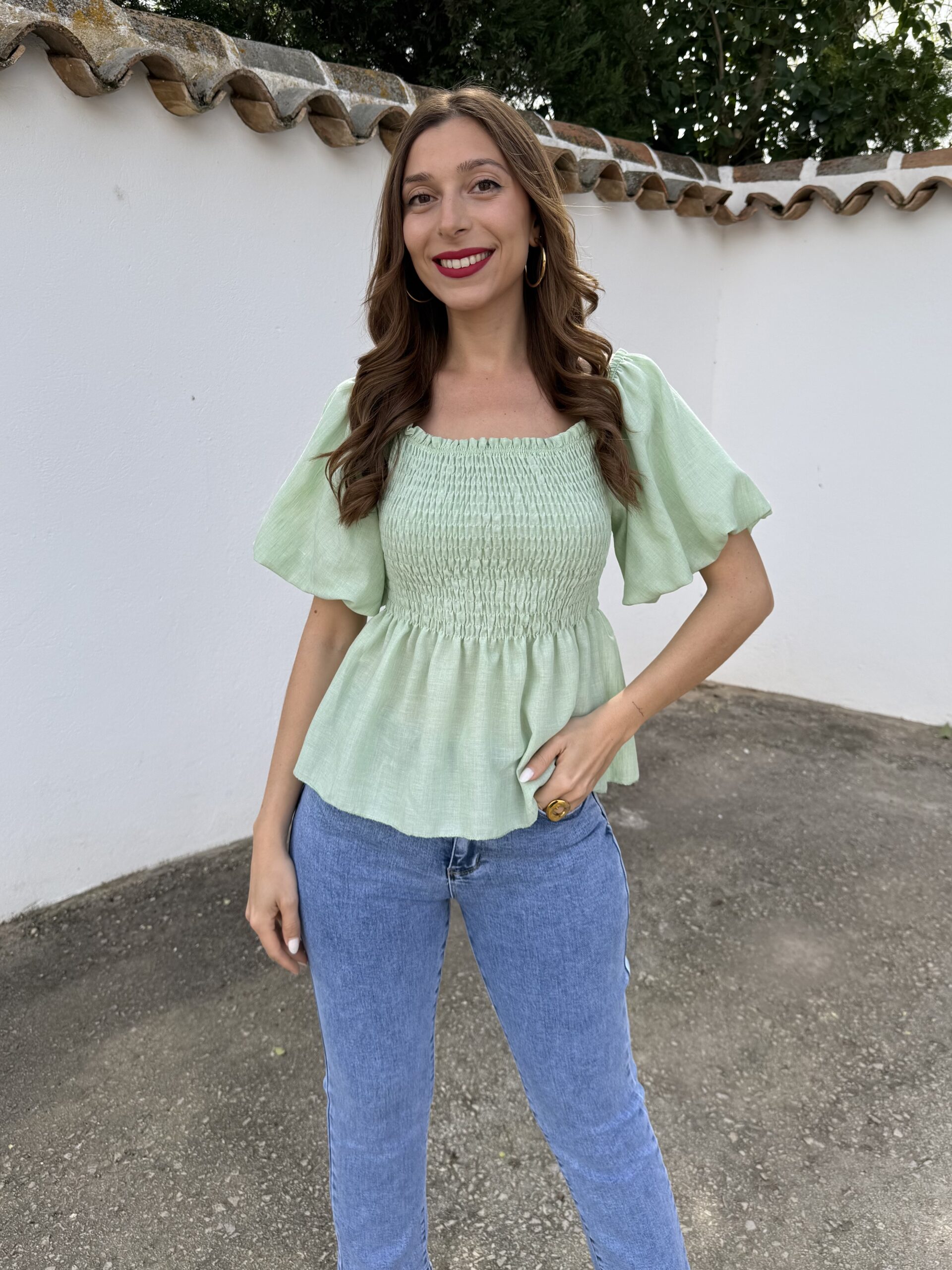 Una prenda delicada y femenina que no puede faltar en tu armario. Esta blusa en color verde destaca por su cuerpo fruncido que se adapta cómodamente a la silueta, realzando la figura con un ajuste favorecedor. Sus mangas cortas con vuelo aportan un toque romántico y ligero, ideal para los días más cálidos.