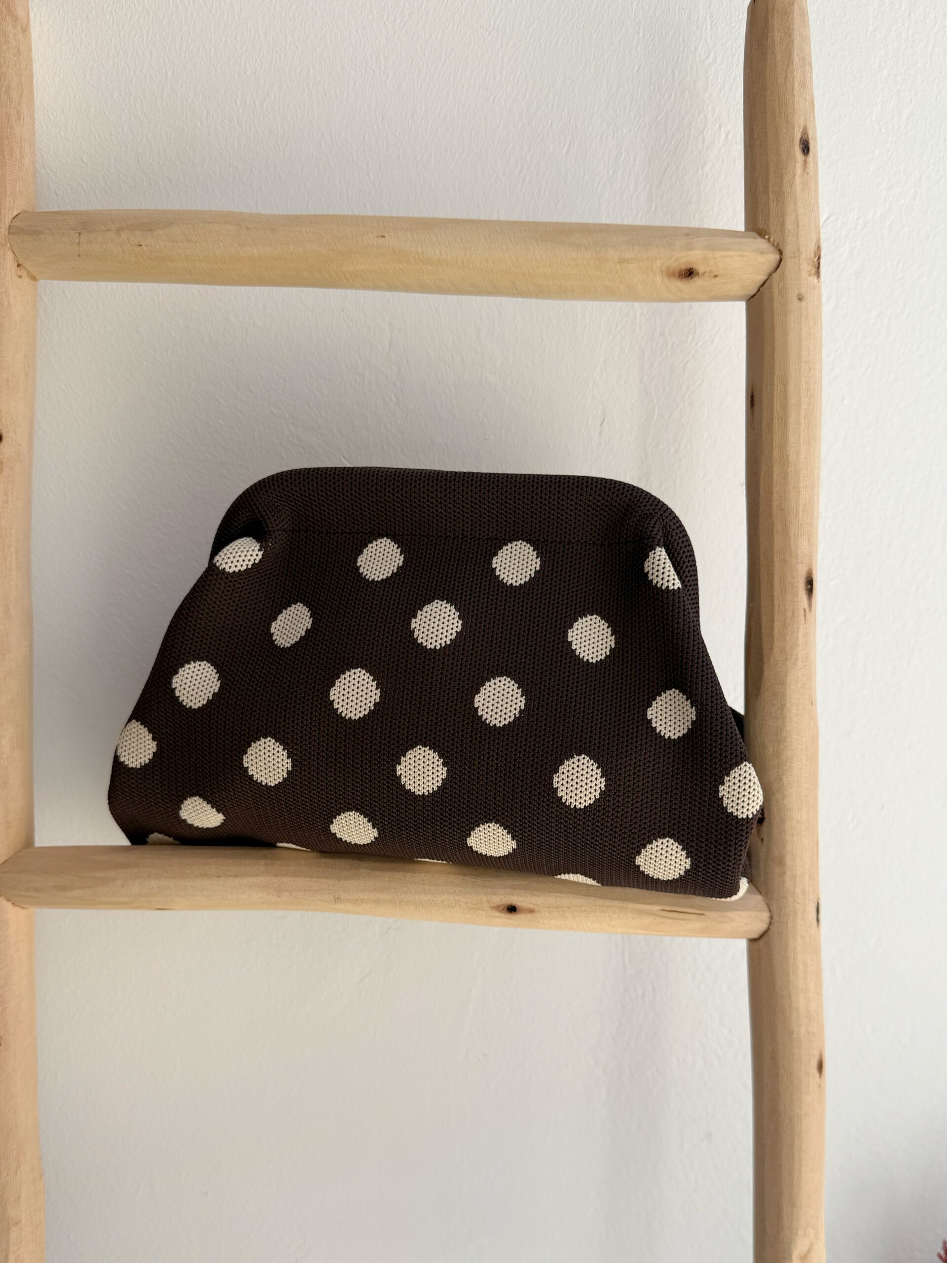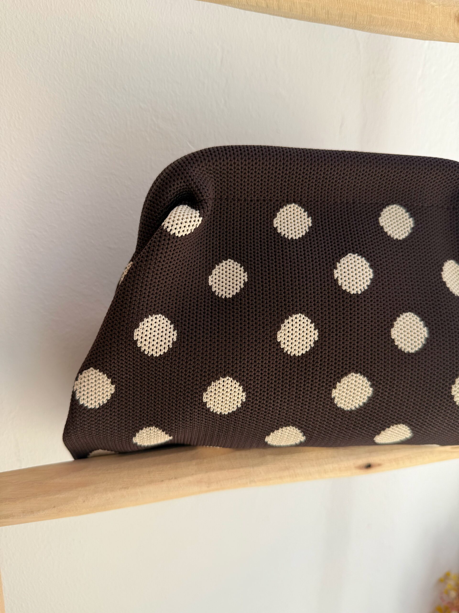 Un bolso que combina estilo y practicidad en cada detalle. Este bolso de mano en tono marrón, confeccionado en tela de alta calidad, destaca por su encantador estampado de lunares beige que aporta un toque elegante y atemporal. Lleva cadena dorada para colgar.
