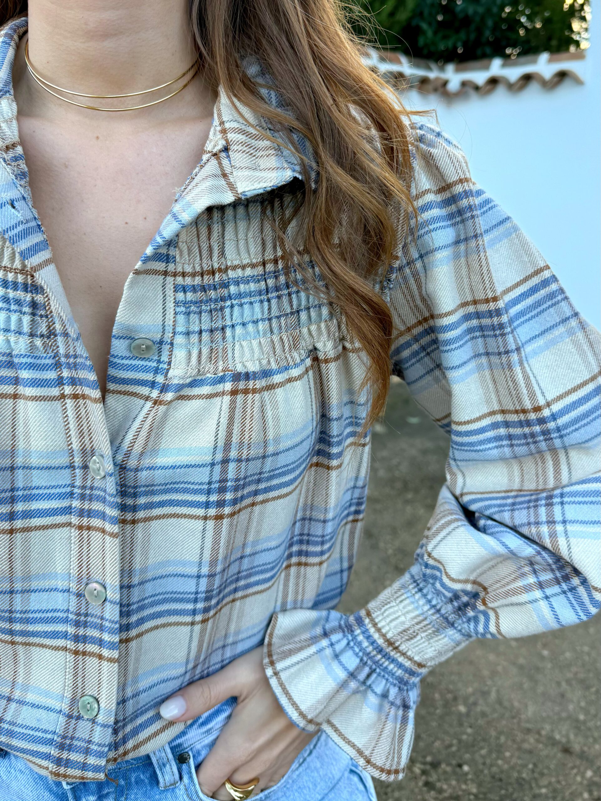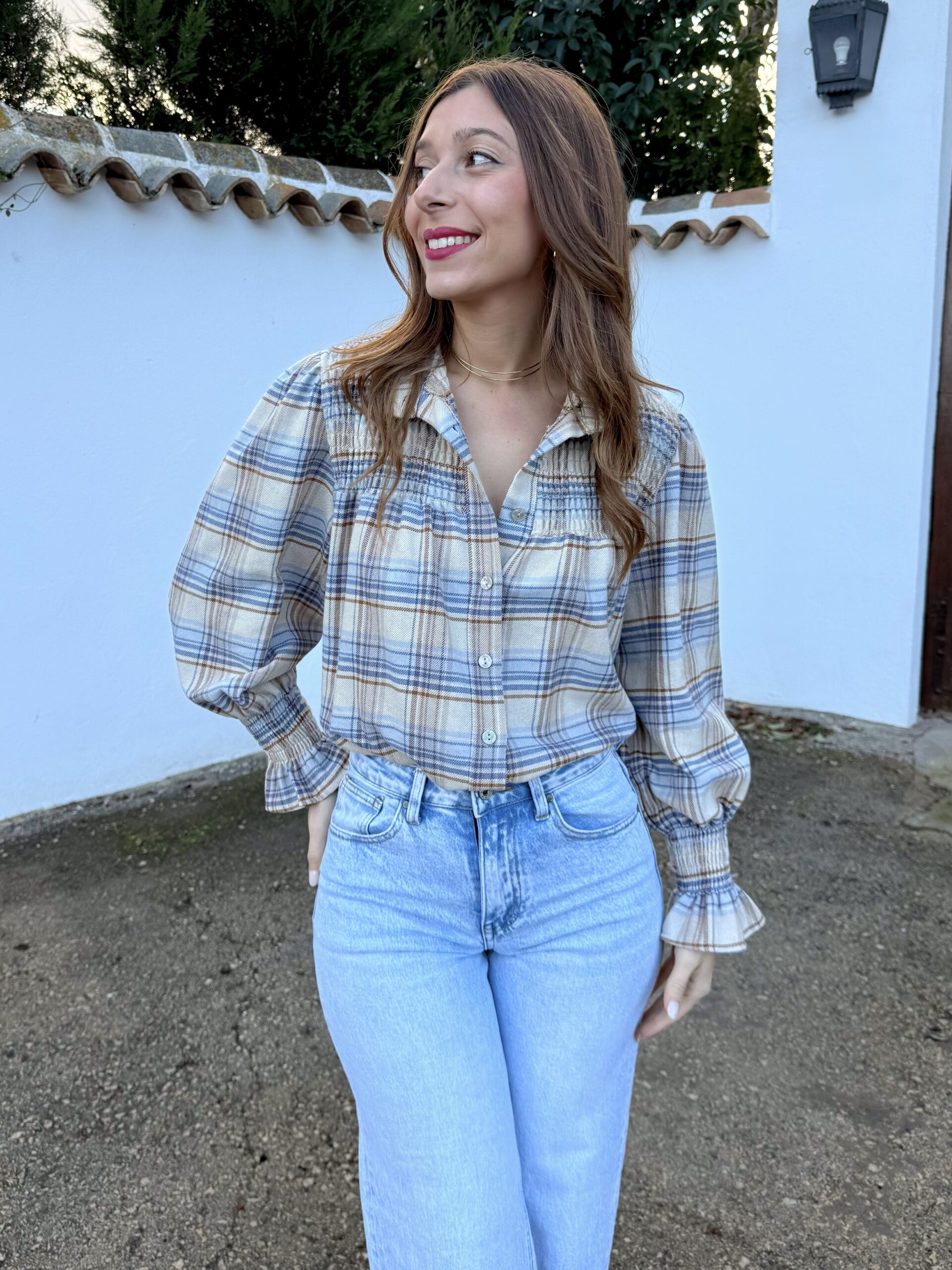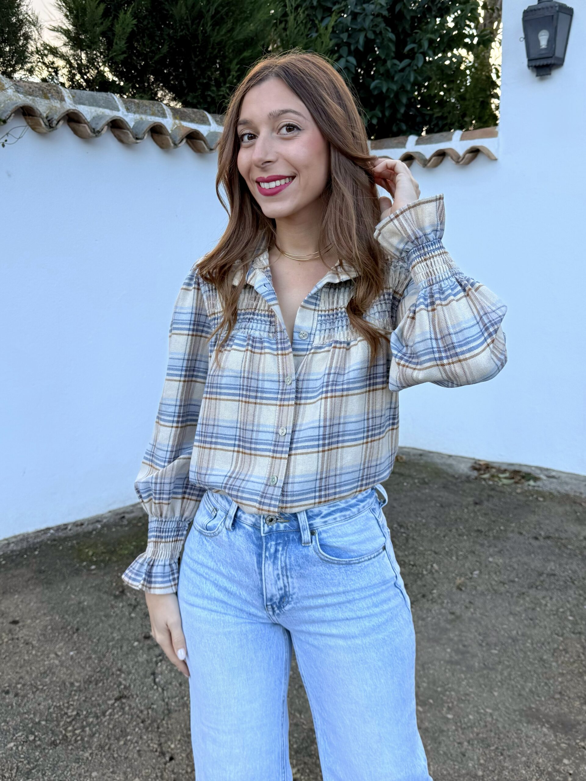 Blusa de cuadros en tonos suaves, con fruncido en la parte superior que aporta caída y un ajuste favorecedor. Diseño con cuello camisero, botones frontales y mangas largas con puño fruncido. Una prenda cómoda y versátil, ideal para looks de diario con estilo.