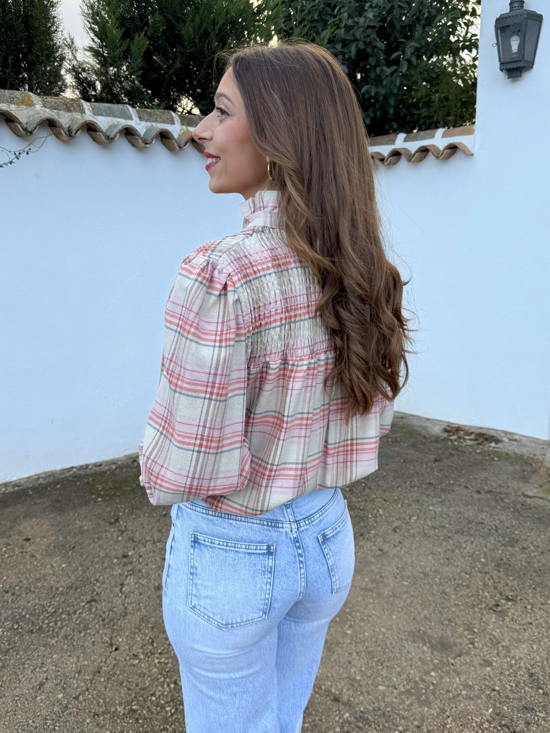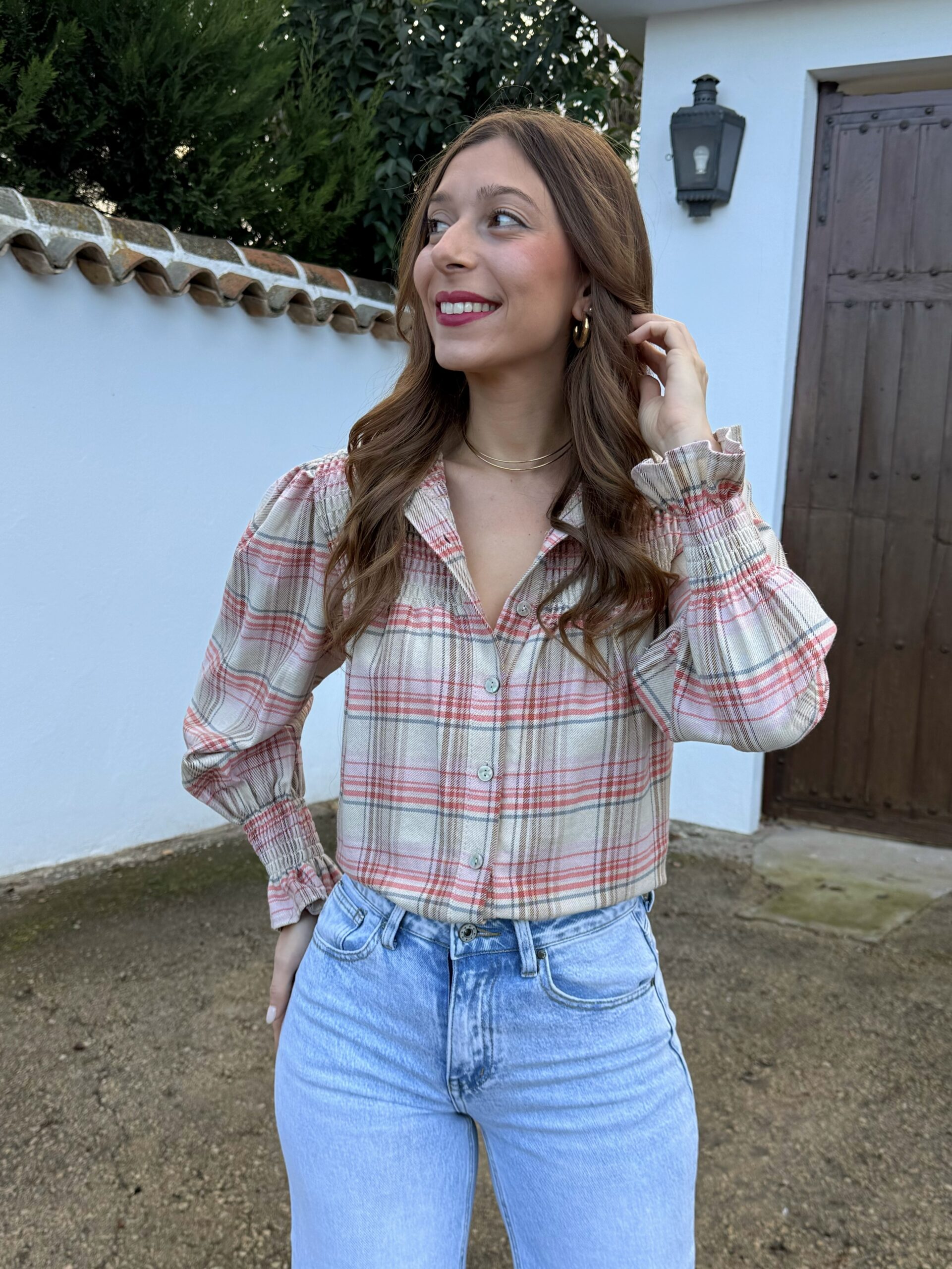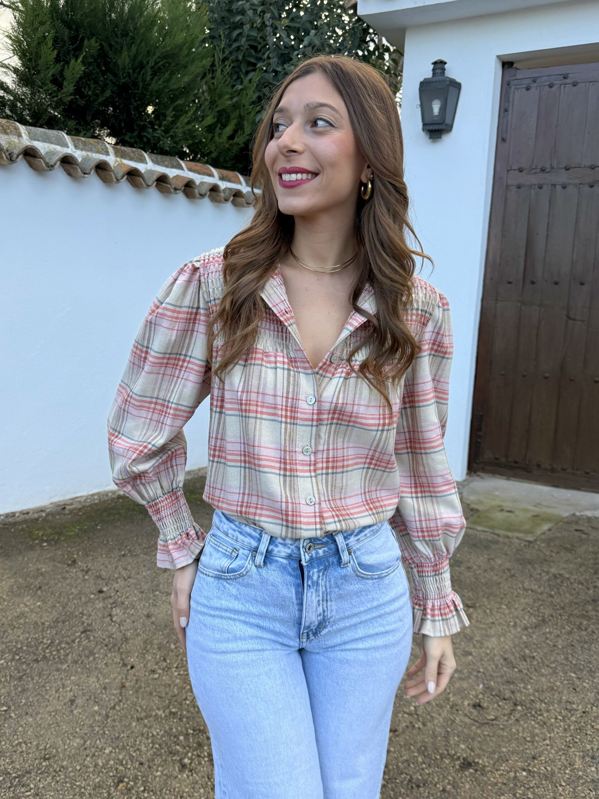 Blusa de cuadros en tonos suaves, con fruncido en la parte superior que aporta caída y un ajuste favorecedor. Diseño con cuello camisero, botones frontales y mangas largas con puño fruncido. Una prenda cómoda y versátil, ideal para looks de diario con estilo.