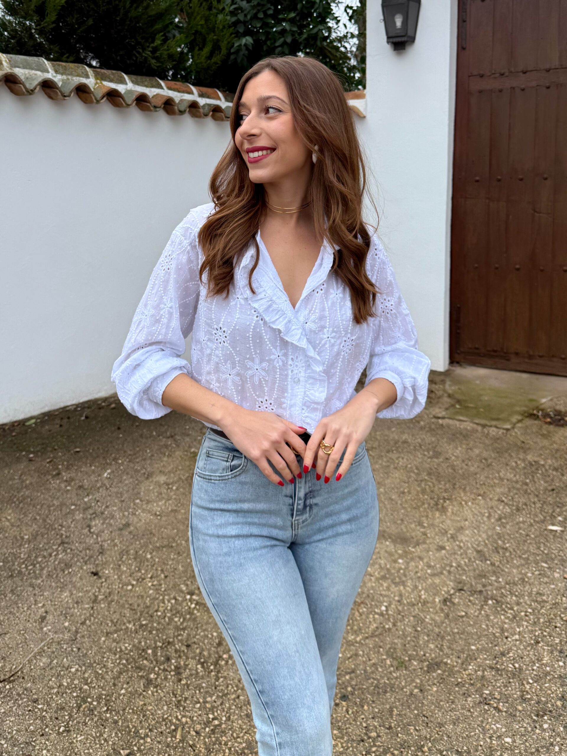 Camisa romántica en tono blanco, confeccionada en algodón bordado con delicado calado floral. Su diseño destaca por el volante frontal que aporta movimiento y un toque especial, junto con su escote en pico que estiliza la silueta. Manga larga ligeramente abullonada con acabado fluido para un look cómodo y favorecedor.