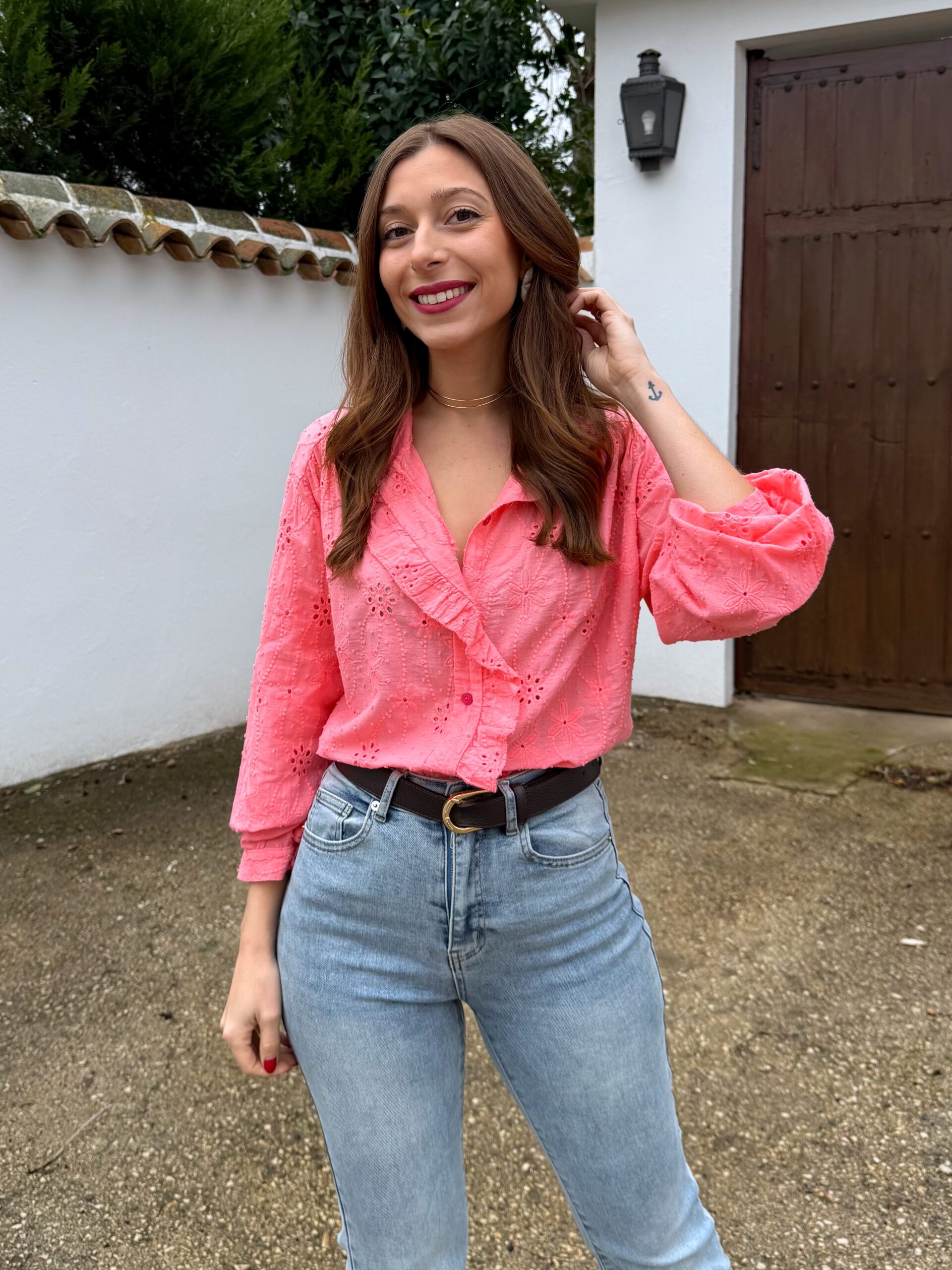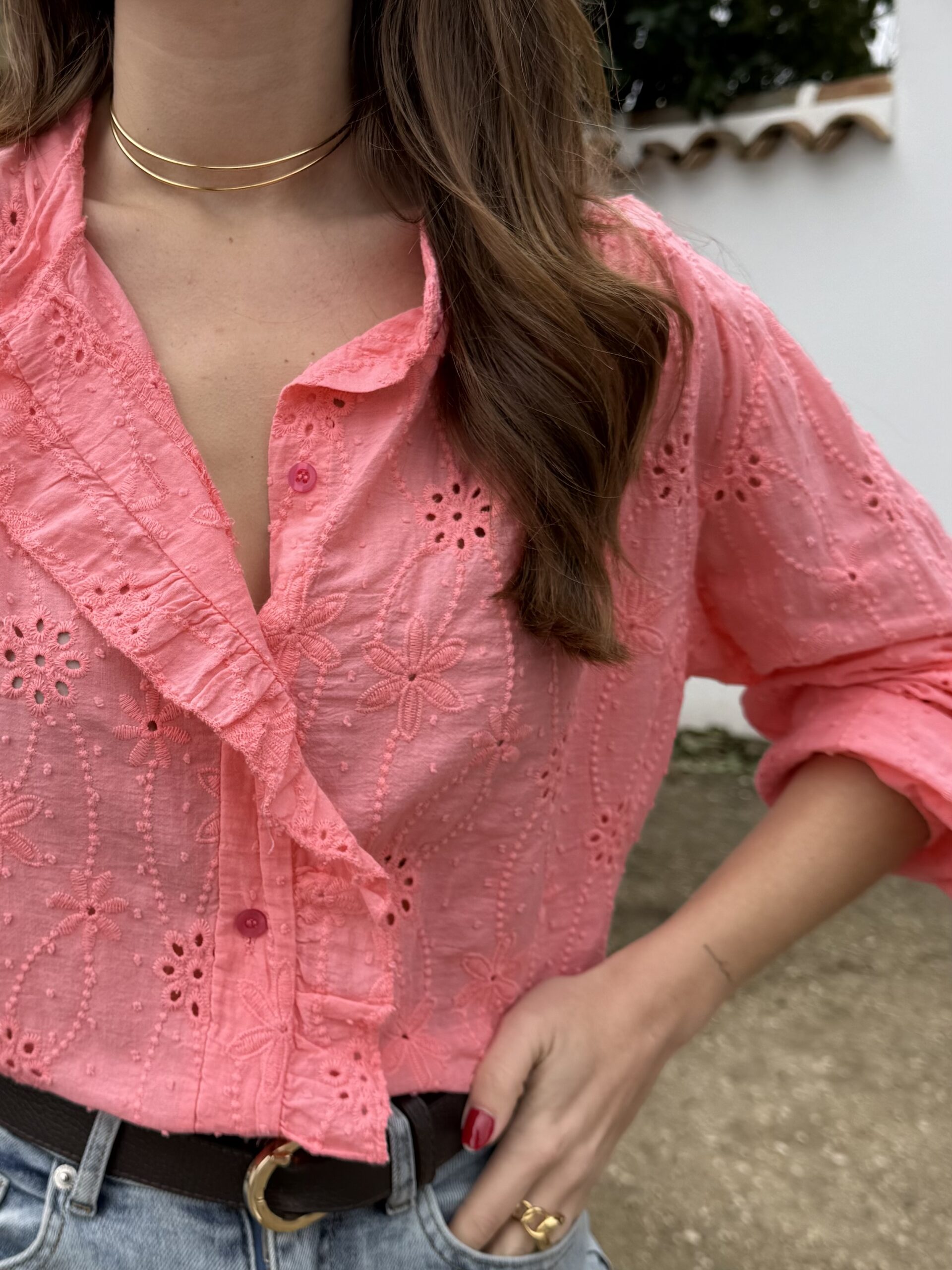 Camisa romántica en tono coral confeccionada en algodón bordado con delicado calado floral. Su diseño destaca por el volante frontal que aporta movimiento y un toque especial, junto con su escote en pico que estiliza la silueta. Manga larga ligeramente abullonada con acabado fluido para un look cómodo y favorecedor.
