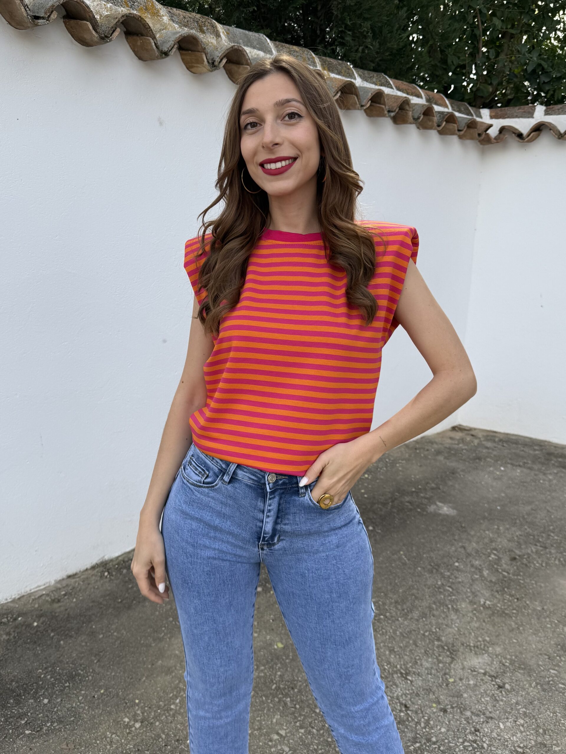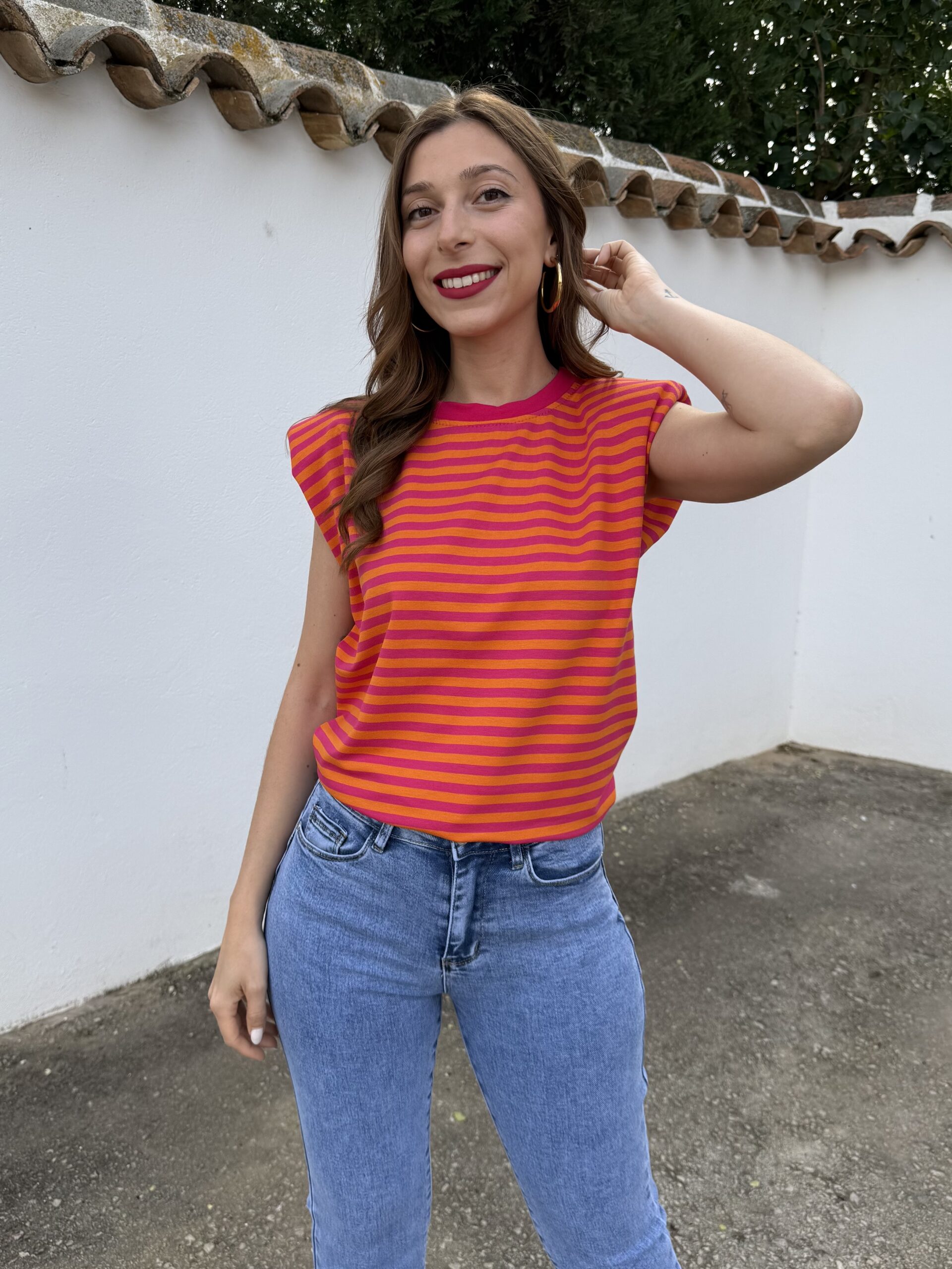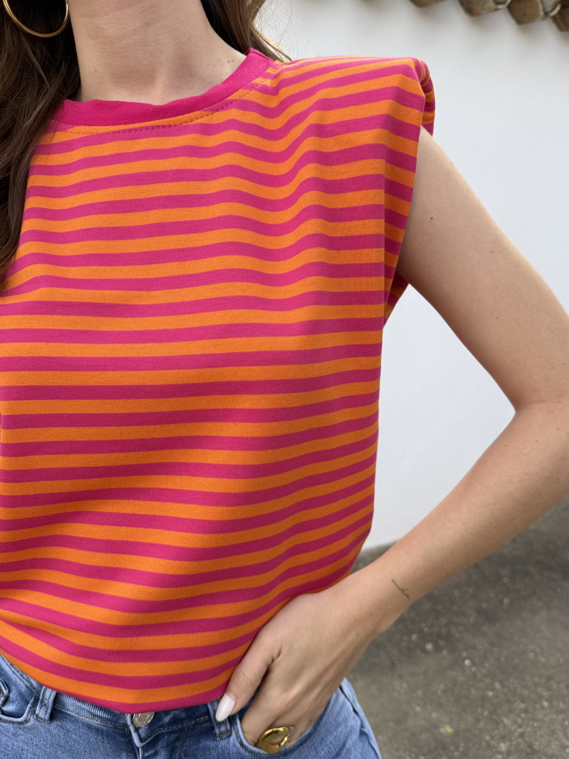 Aporta color y personalidad a tus looks con esta camiseta de rayas en tonos vibrantes. Su diseño combina un estampado llamativo con un corte moderno, destacando las hombreras que estructuran la silueta y aportan un toque sofisticado y actual.