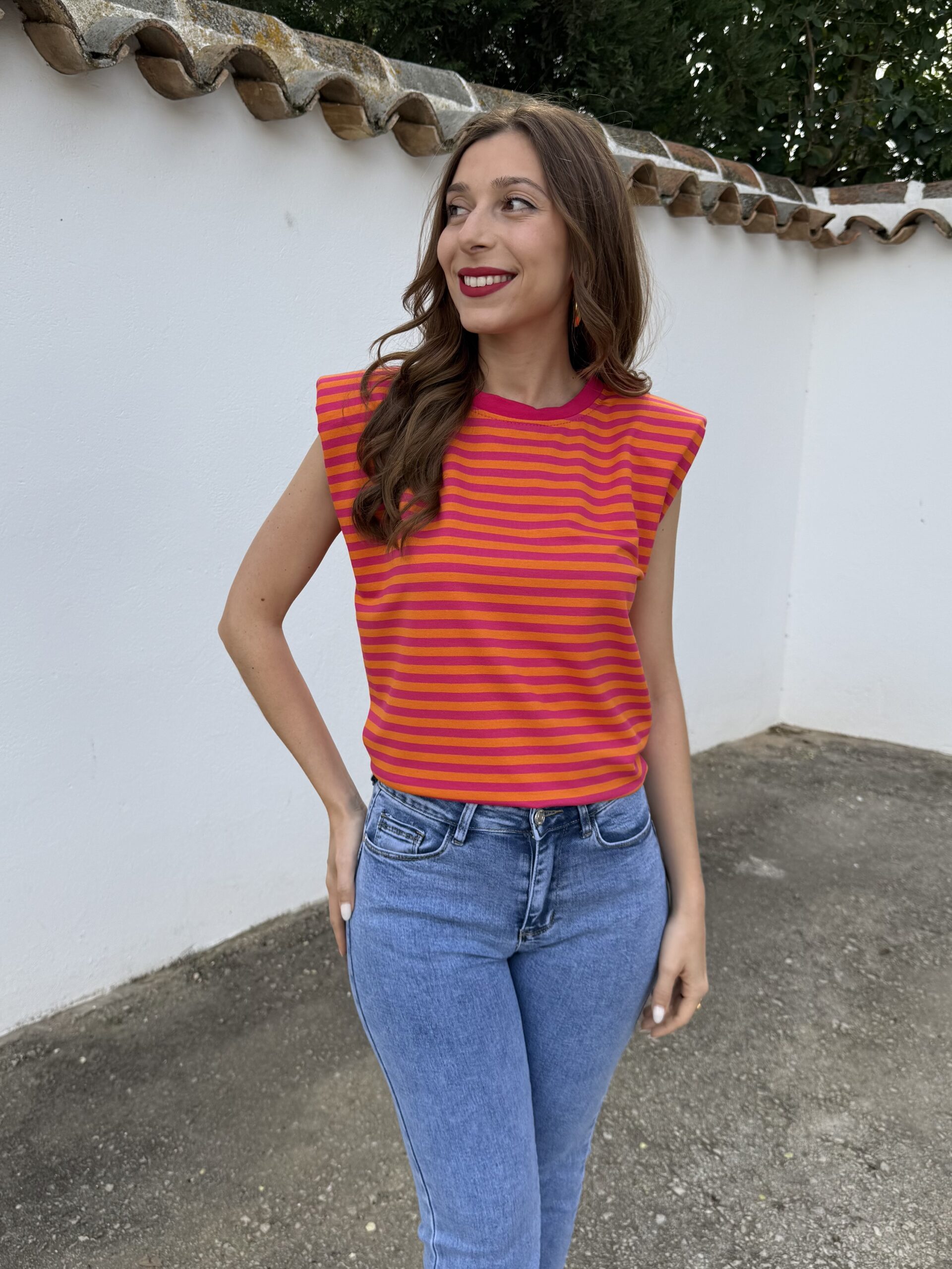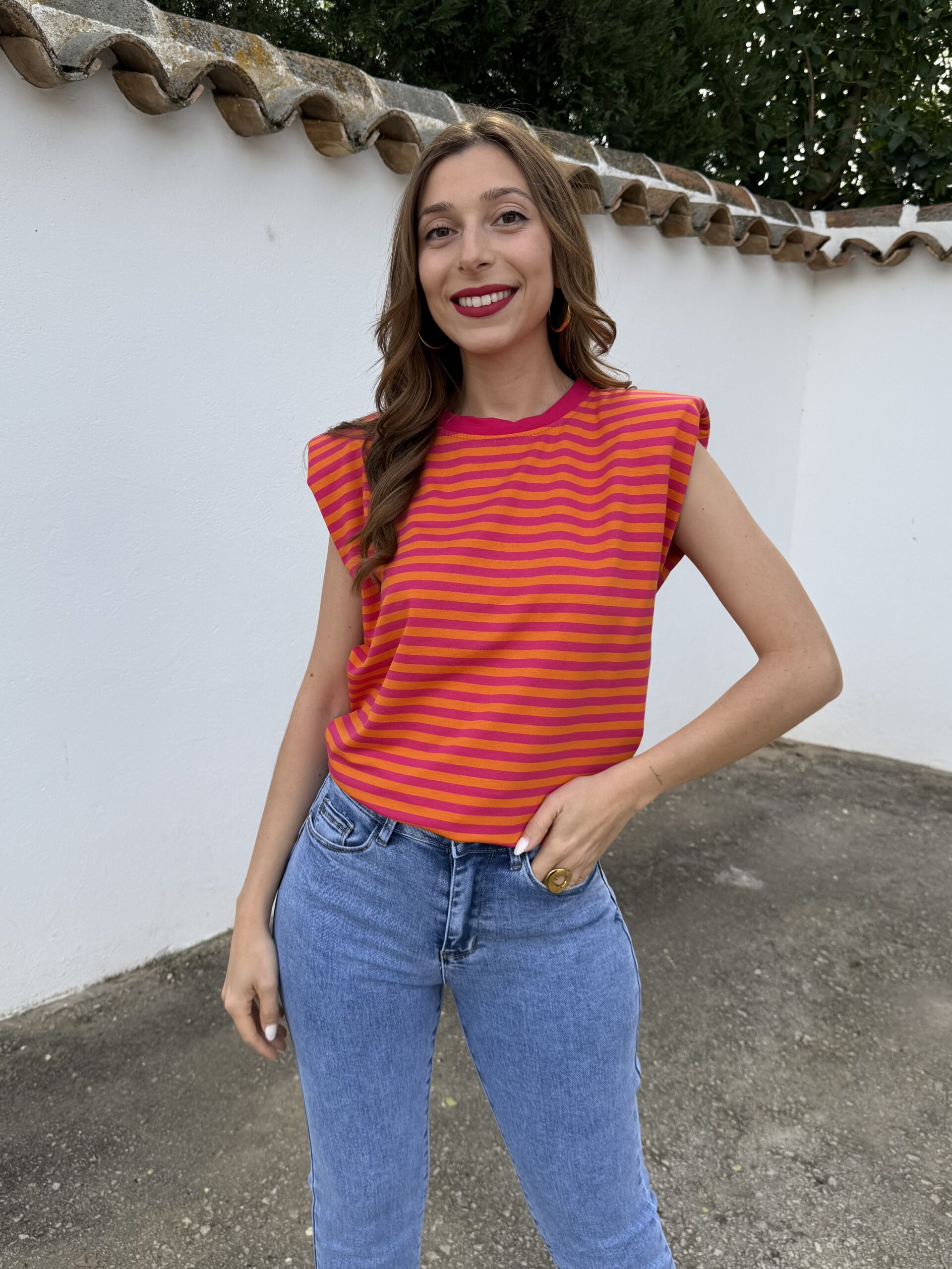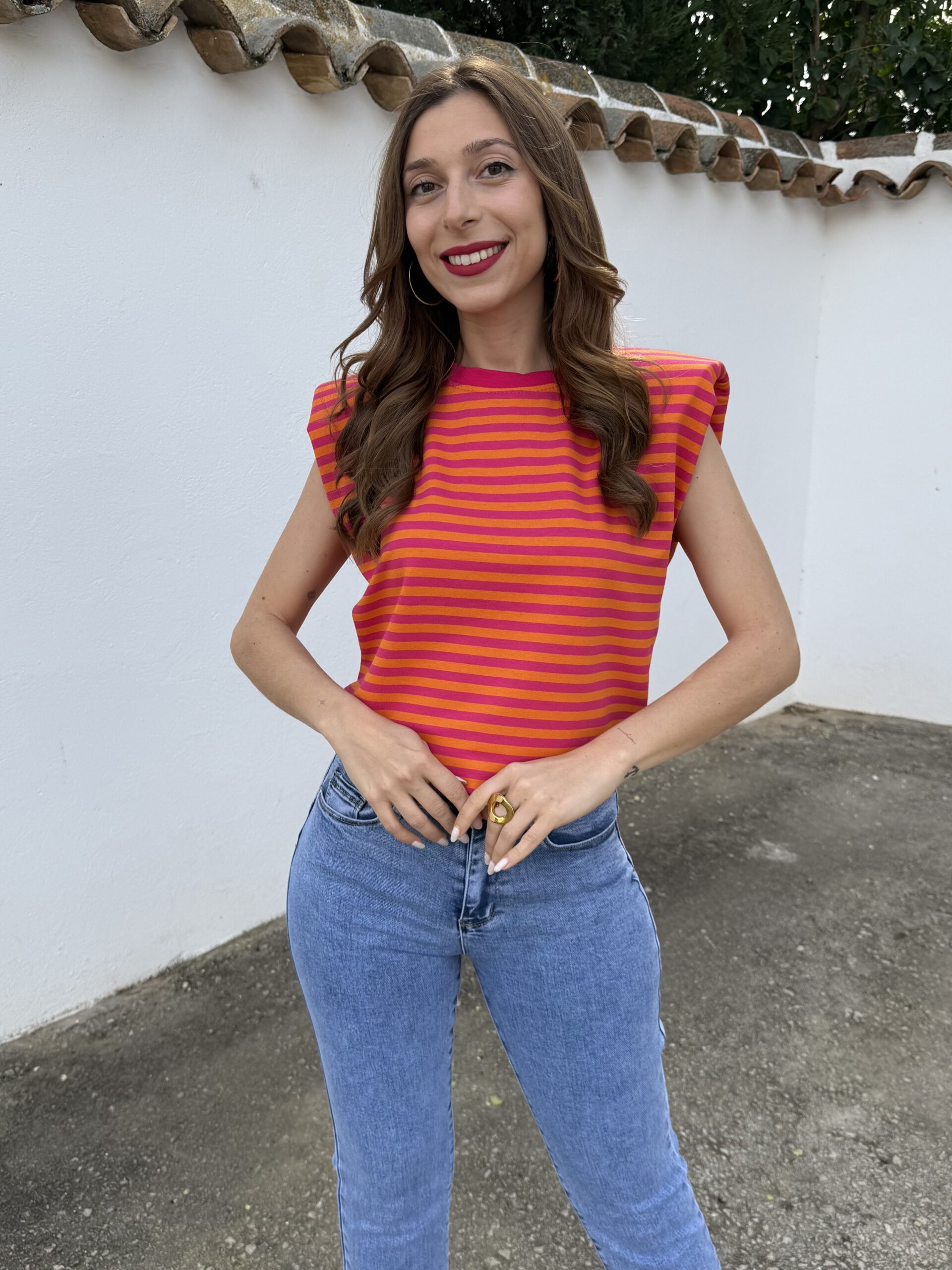 Aporta color y personalidad a tus looks con esta camiseta de rayas en tonos vibrantes. Su diseño combina un estampado llamativo con un corte moderno, destacando las hombreras que estructuran la silueta y aportan un toque sofisticado y actual.
