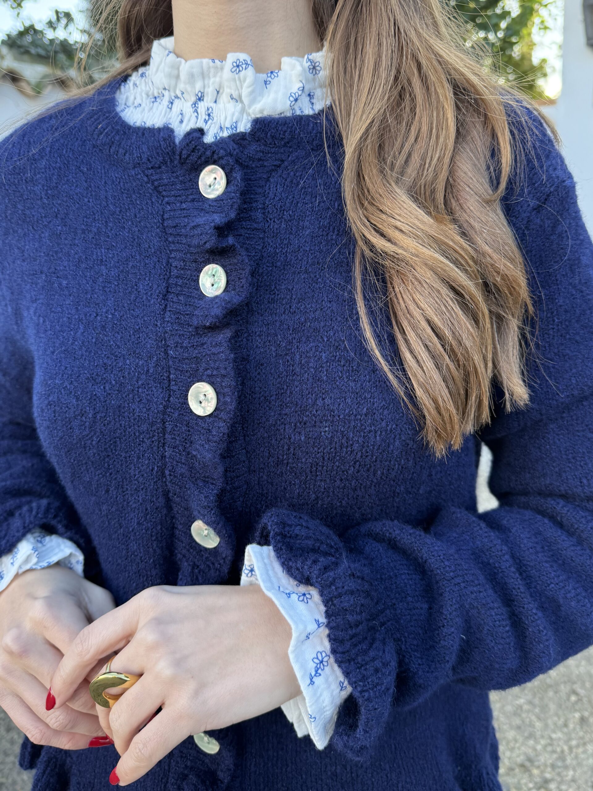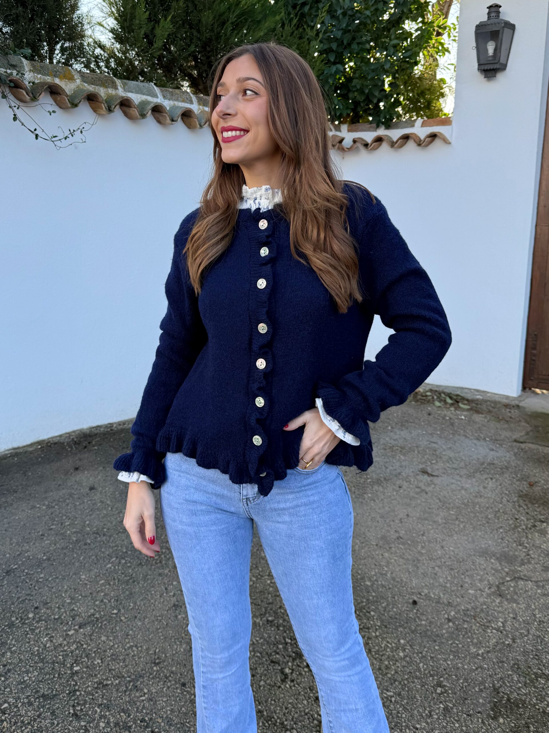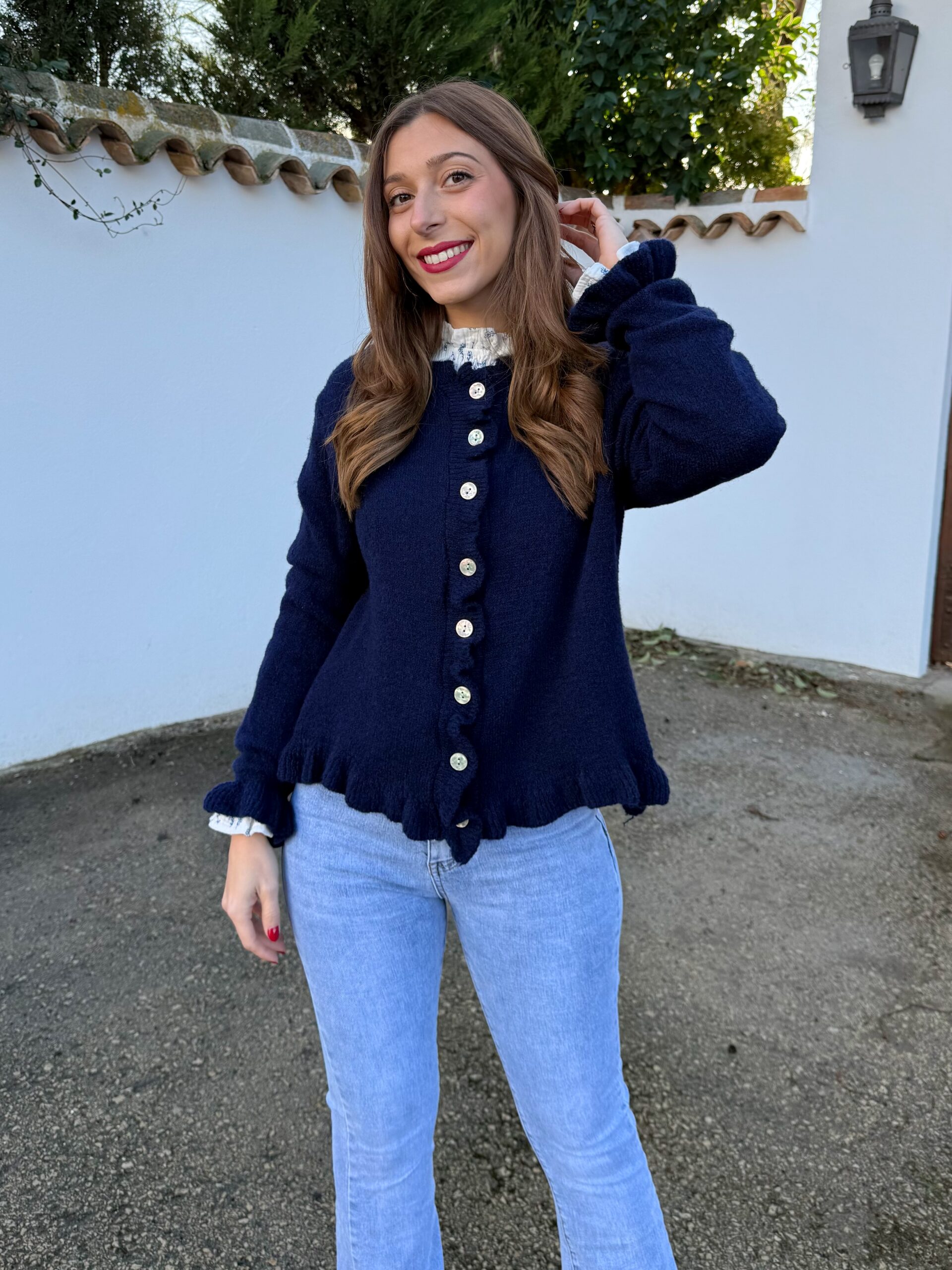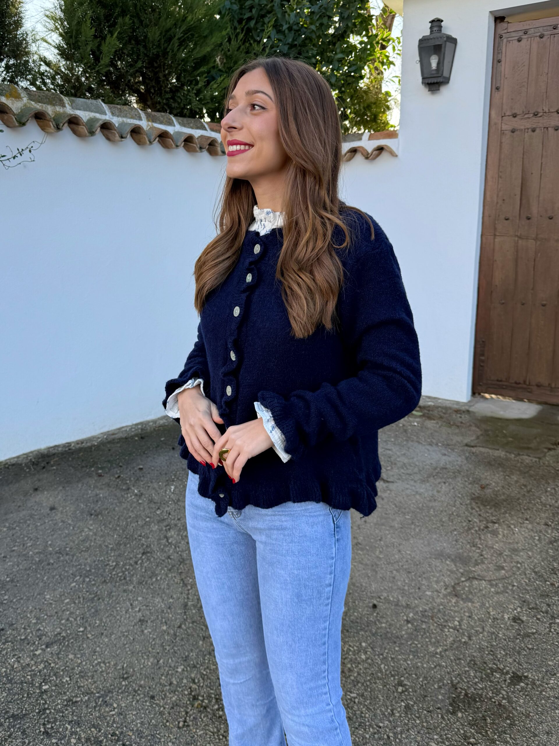 Cárdigan de punto suave con cierre frontal de botones y acabado ligeramente ondulado en bajo y puños. Un básico especial, cómodo y fácil de combinar, perfecto para el día a día y para completar looks de entretiempo.