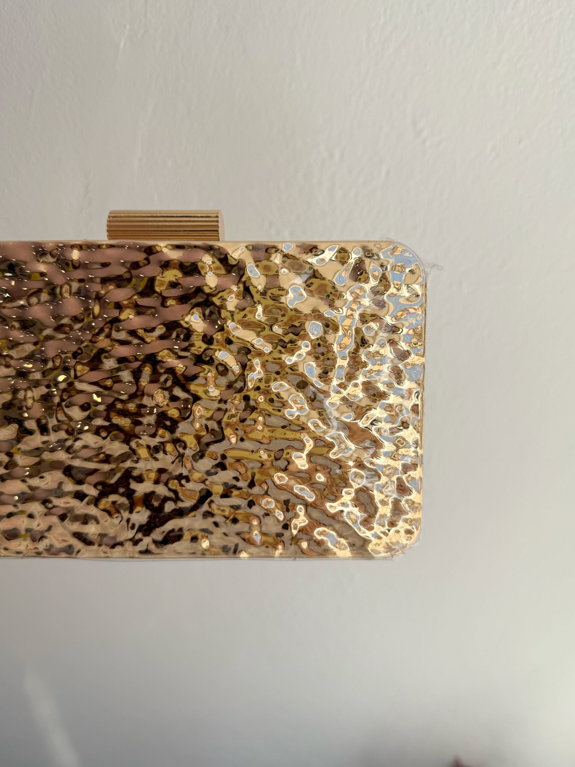 La pieza que transforma cualquier look en algo especial. Esta cartera rígida en acabado dorado efecto martelé capta la luz en cada movimiento, creando un brillo único y sofisticado que no pasa desapercibido.