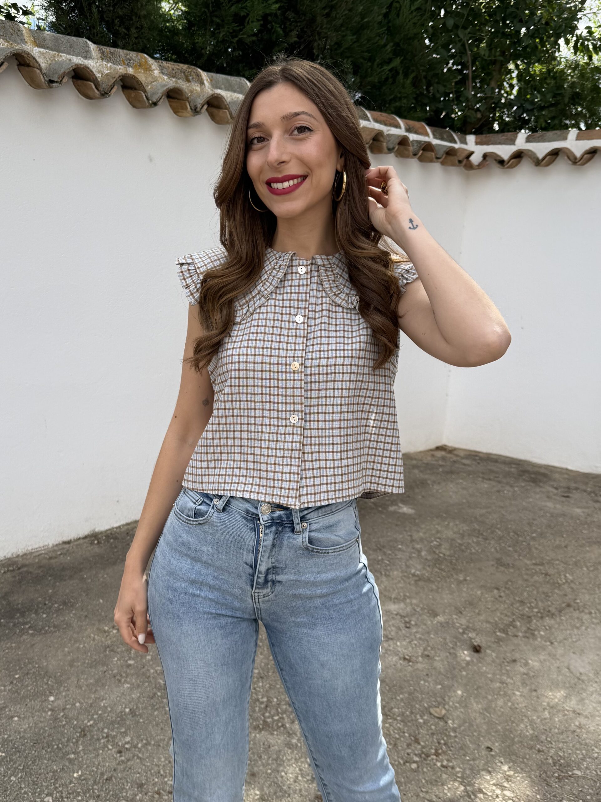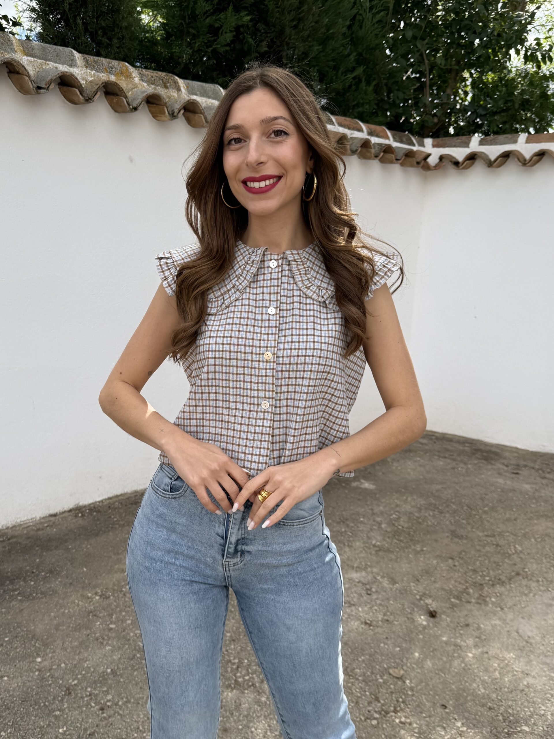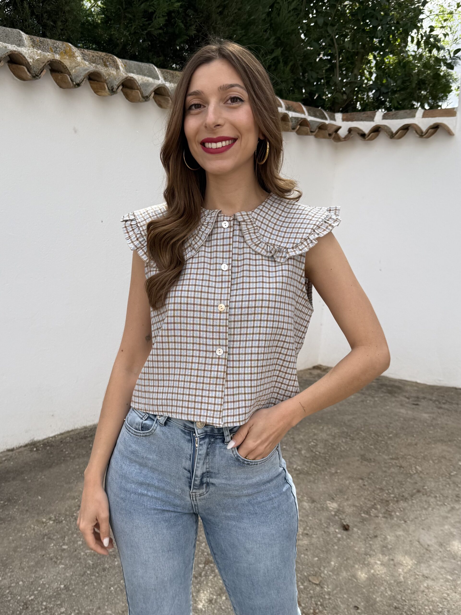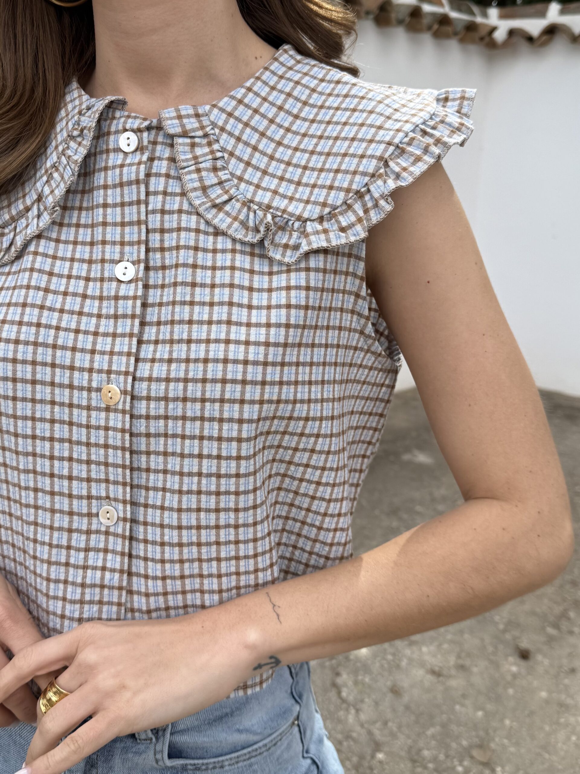 Chaleco sin mangas con diseño de cuadros en tonos fríos que aporta un estilo clásico y versátil. Cuenta con cierre frontal de botones y cuello camisero con baberola, ideal para lograr un look pulido sin esfuerzo. Su corte favorecedor se adapta cómodamente al cuerpo, convirtiéndolo en una prenda perfecta para combinar con jeans, faldas o pantalones.