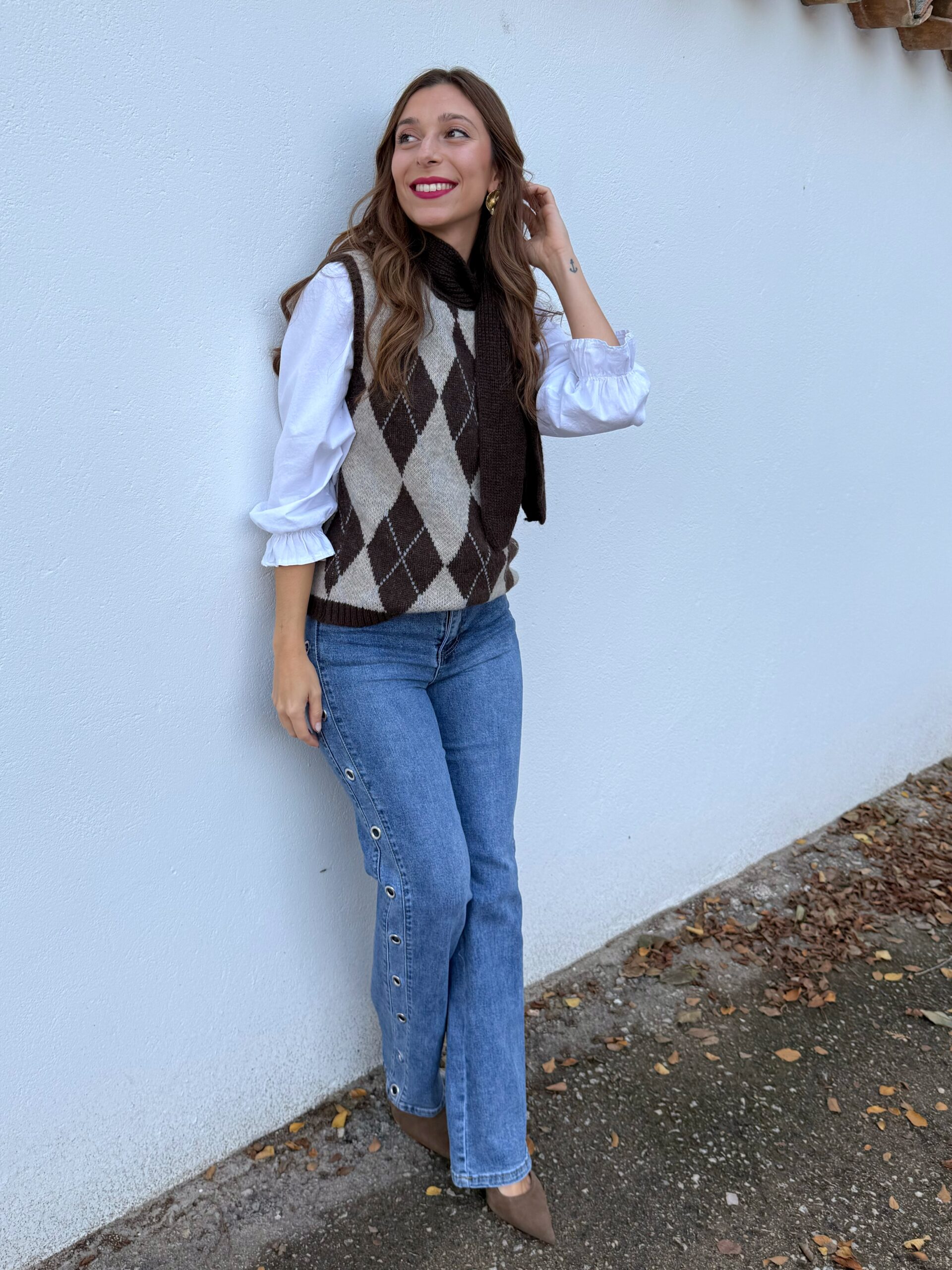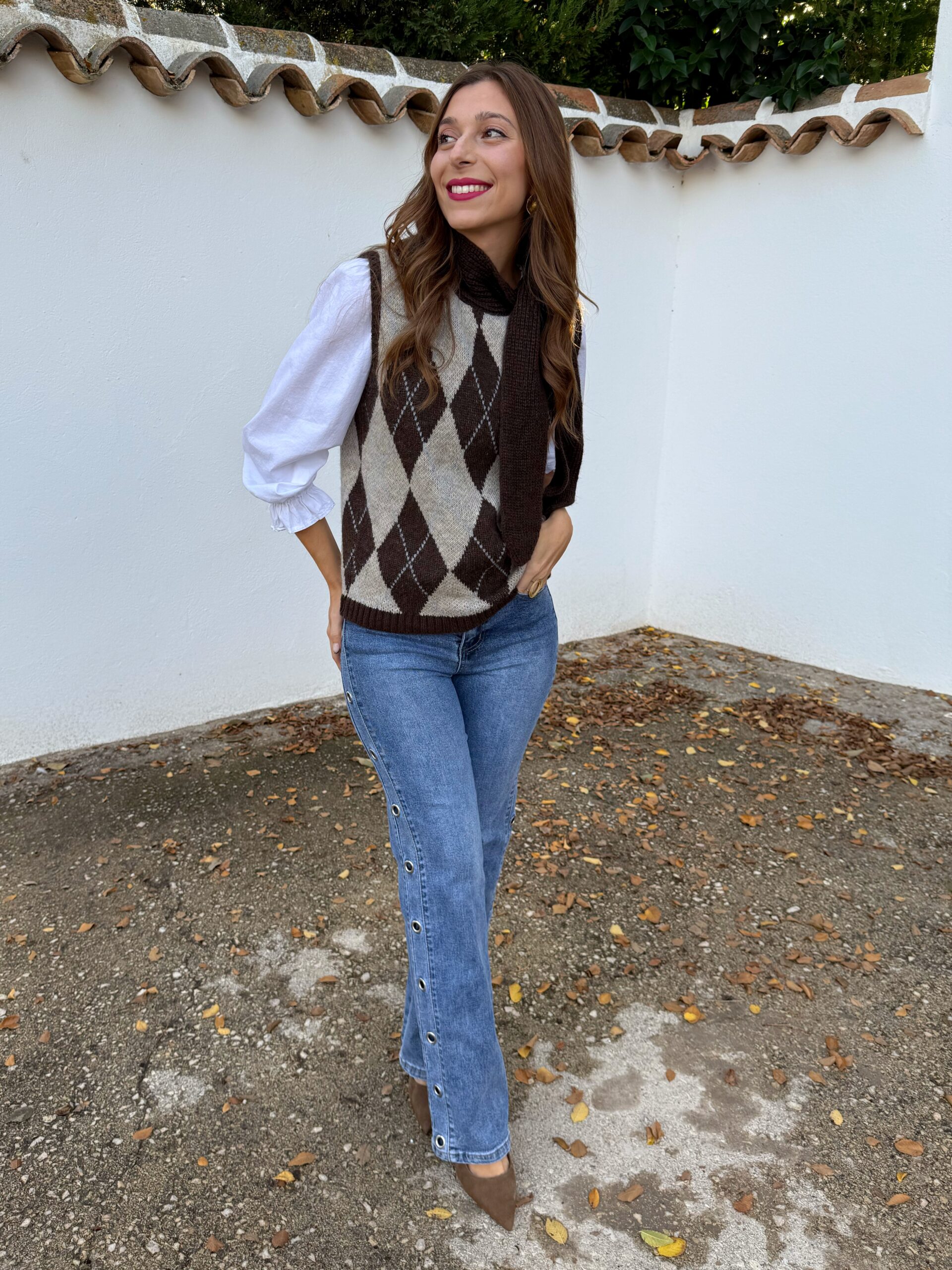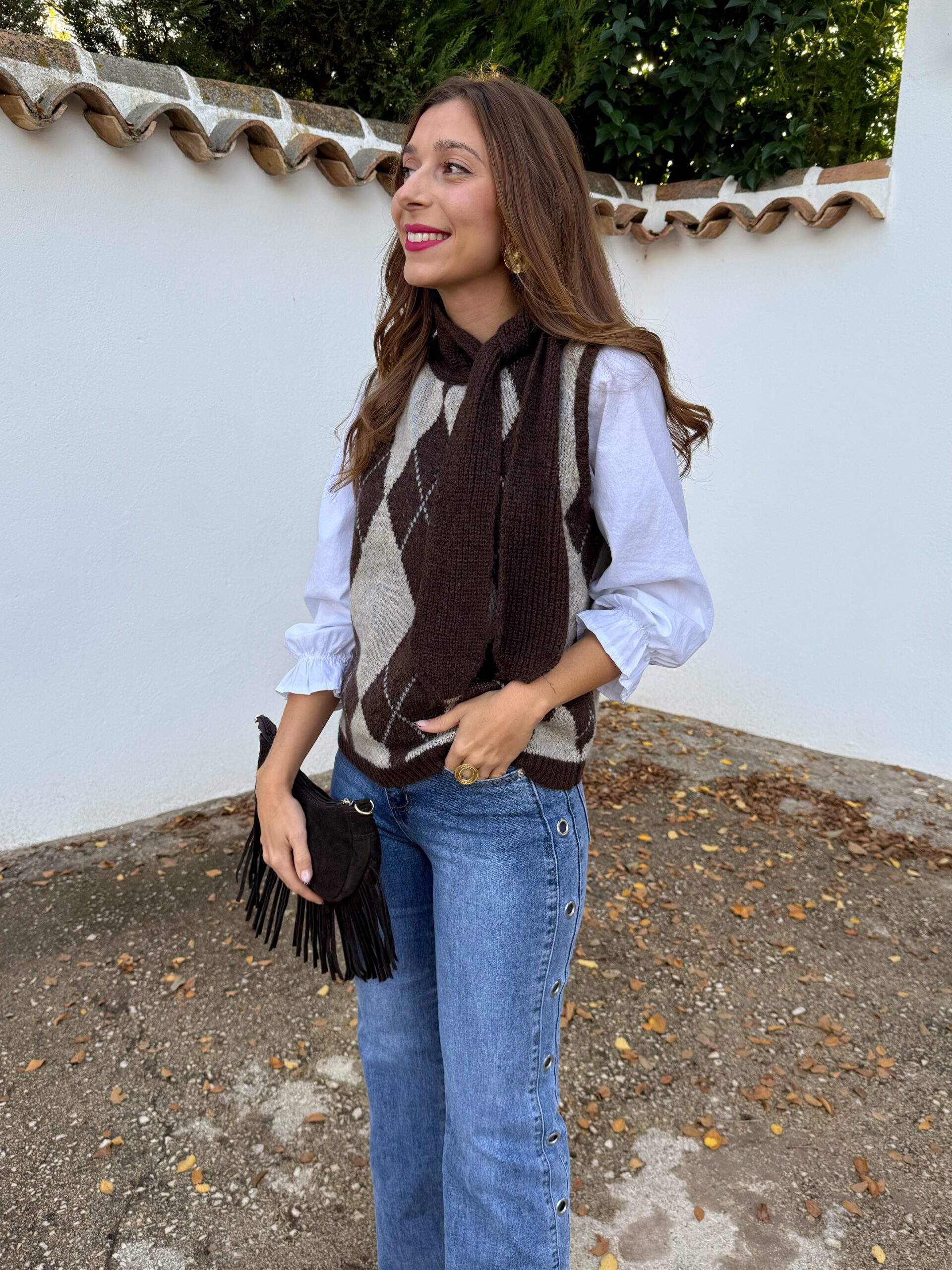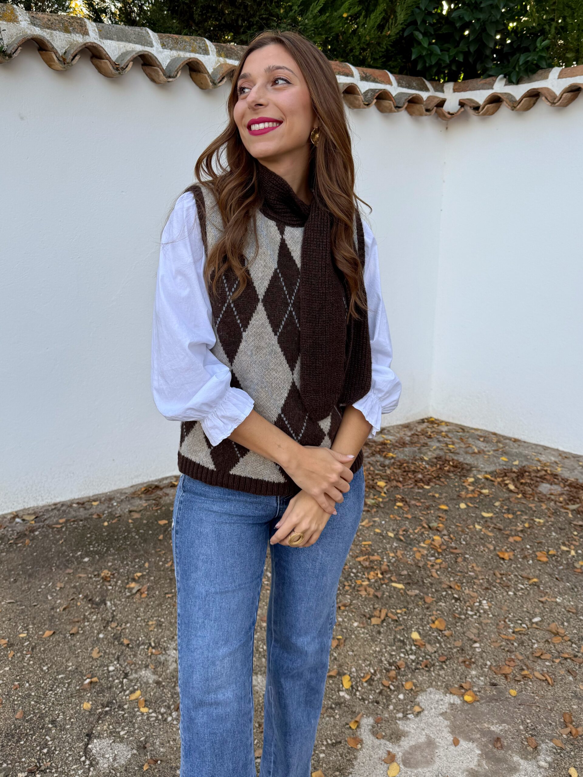 Este chaleco en tono marrón con patrón de rombos es esa prenda clave que transforma en segundos un look sencillo en algo con carácter. Su corte lo hace versátil y cómodo, perfecto para adaptarse a tu estilo sin complicaciones.