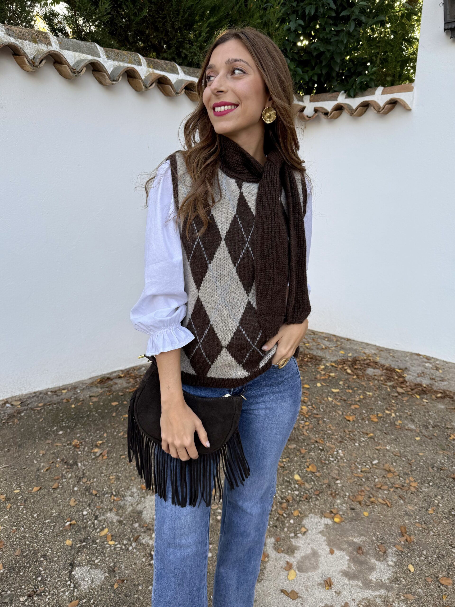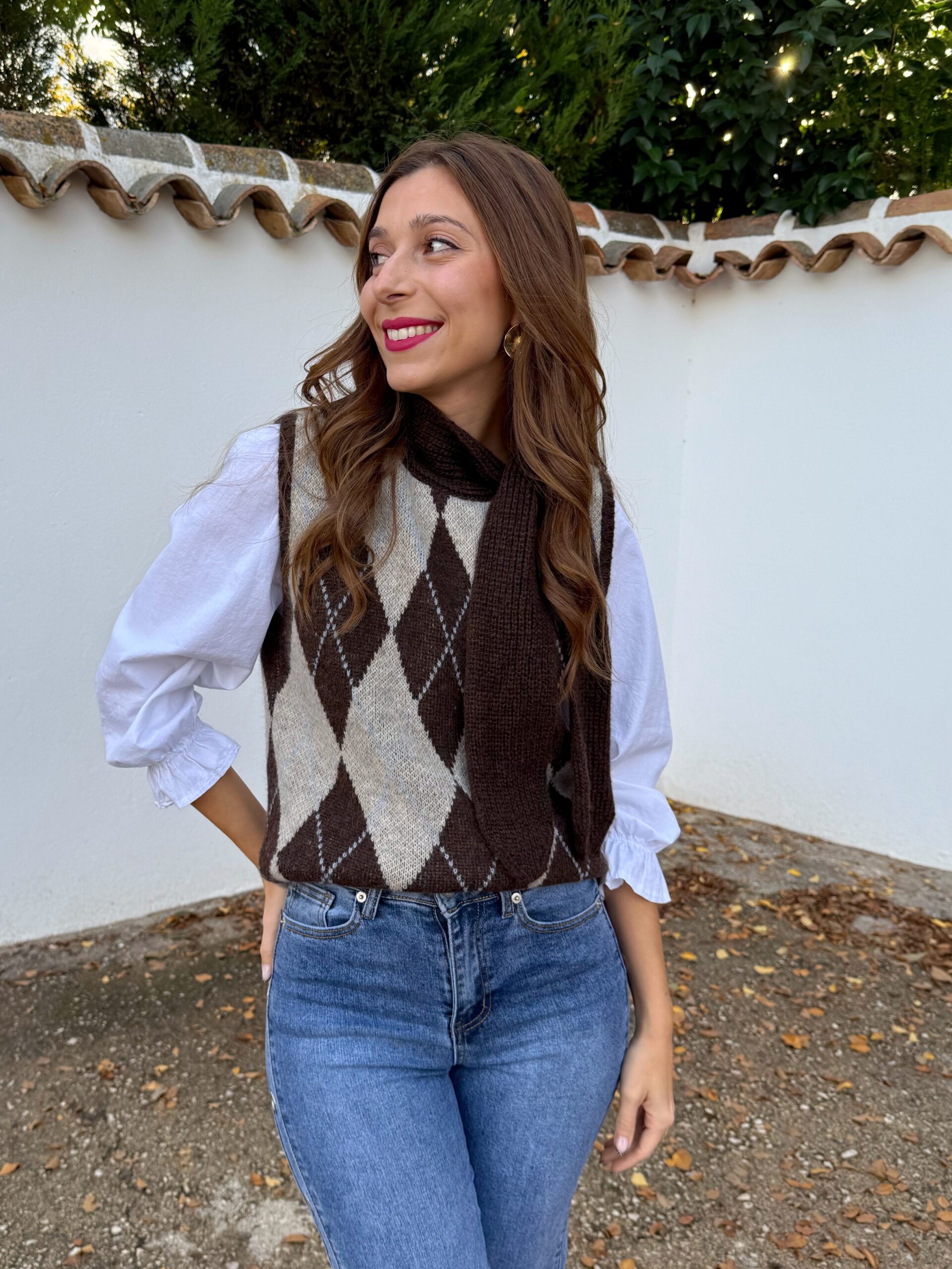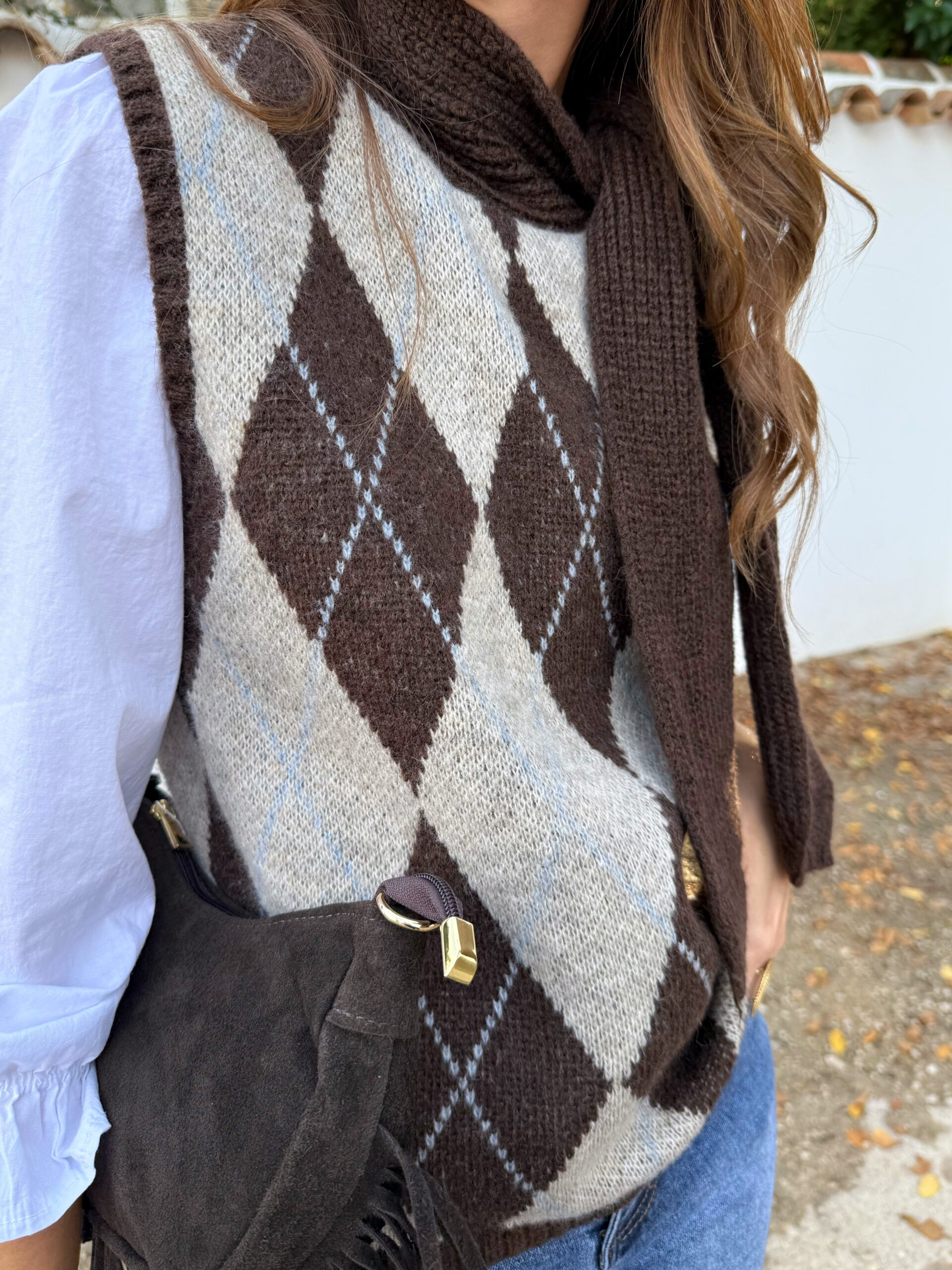 Este chaleco en color tendencia, marrón chocolate con patrón de rombos es esa prenda clave que transforma en segundos un look sencillo en algo con carácter. Su corte lo hace versátil y cómodo, perfecto para adaptarse a tu estilo sin complicaciones.