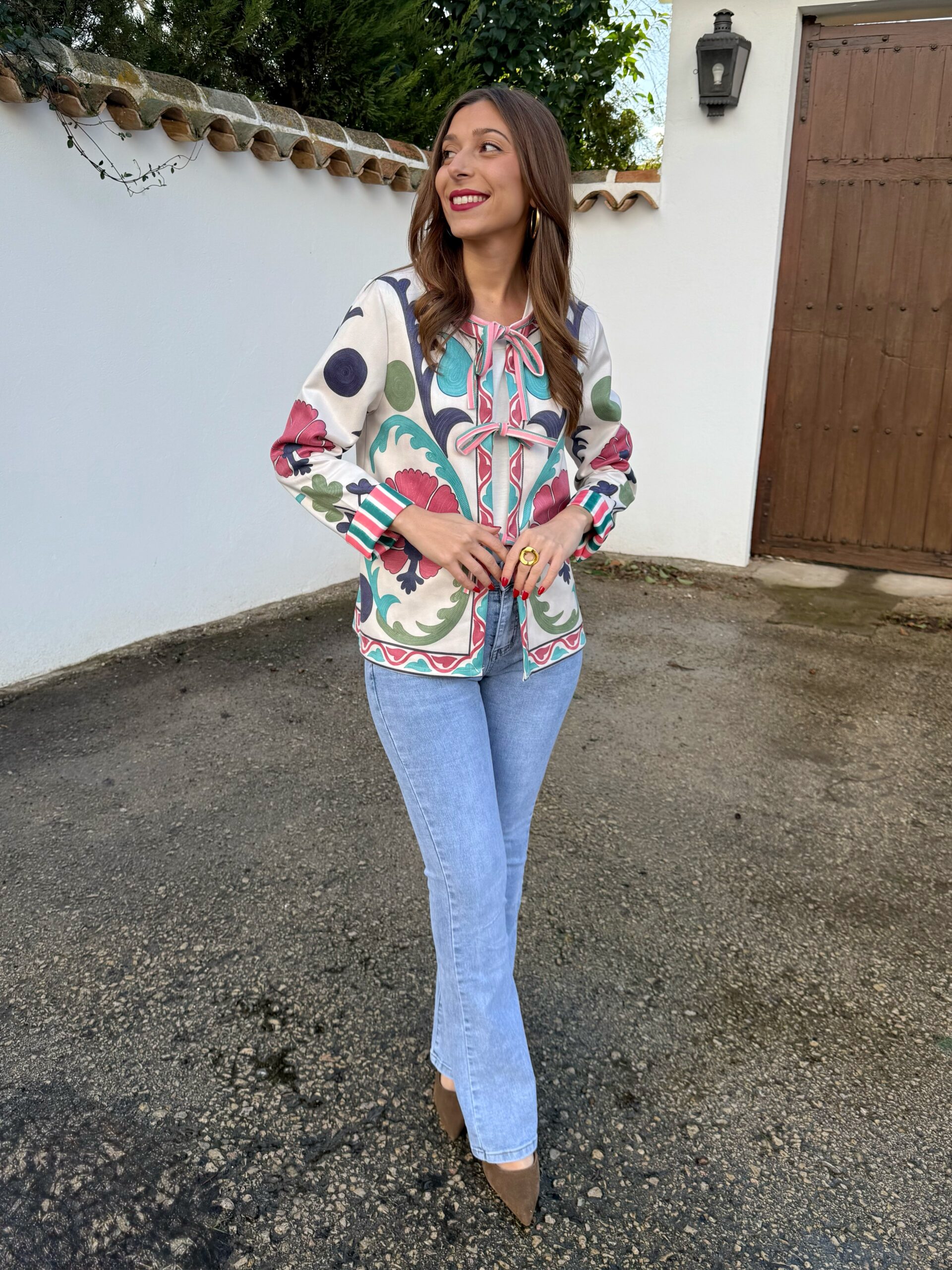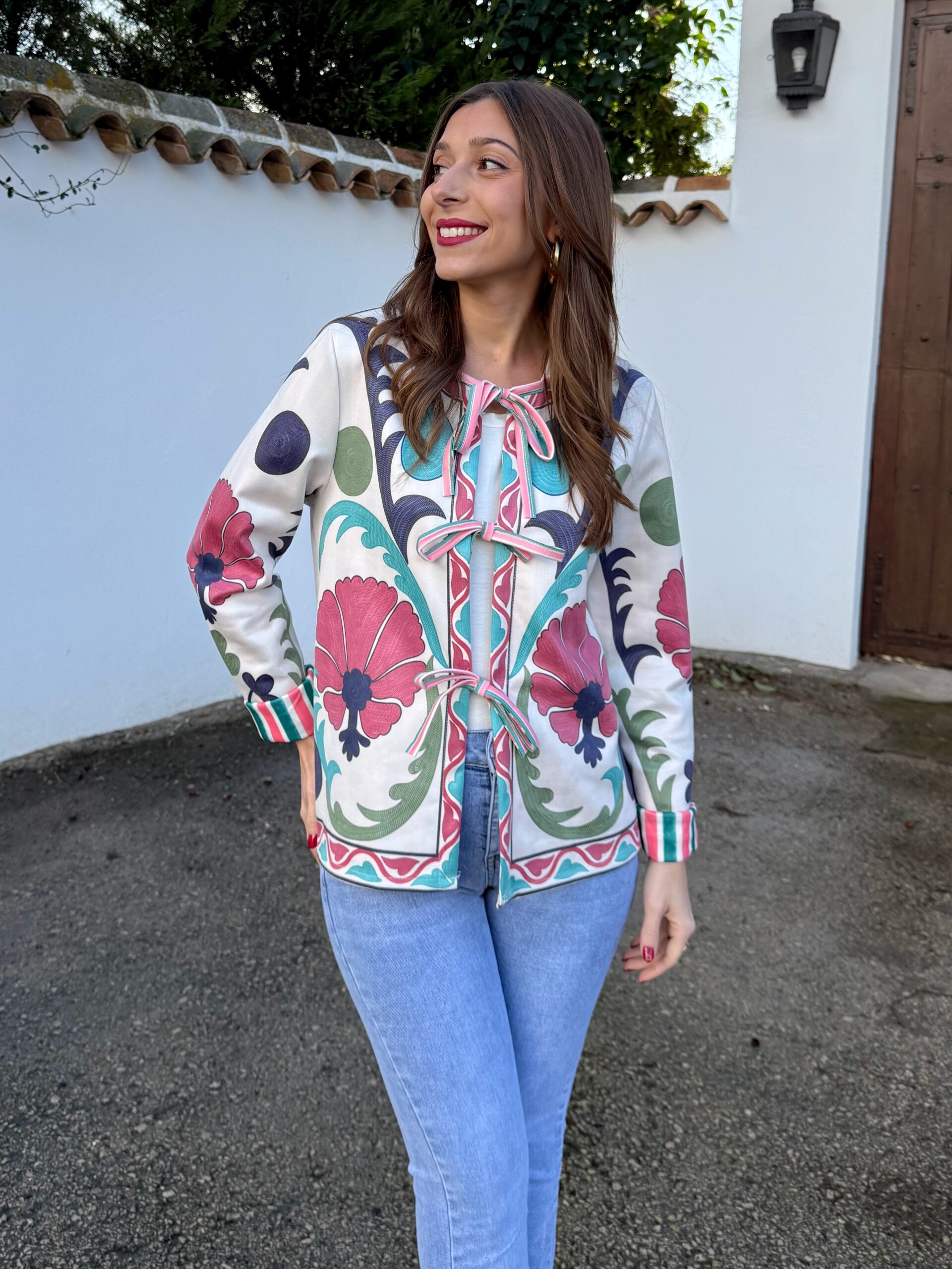 Chaqueta ligera con estampado floral y cierre de lazadas frontales. Destaca por sus puños a contraste y su diseño femenino y original. Ideal para combinar con vaqueros y dar un toque especial a cualquier look de entretiempo.