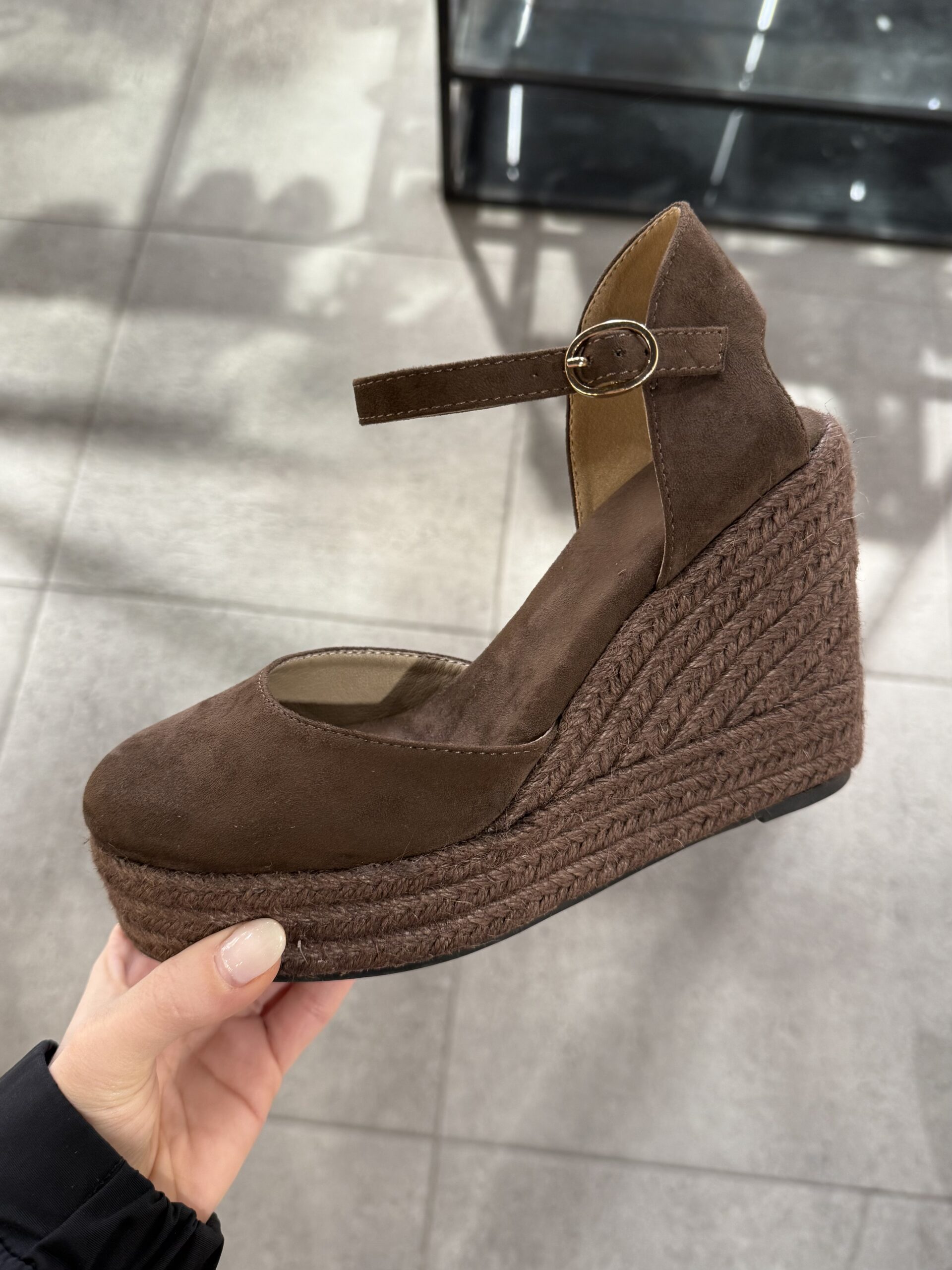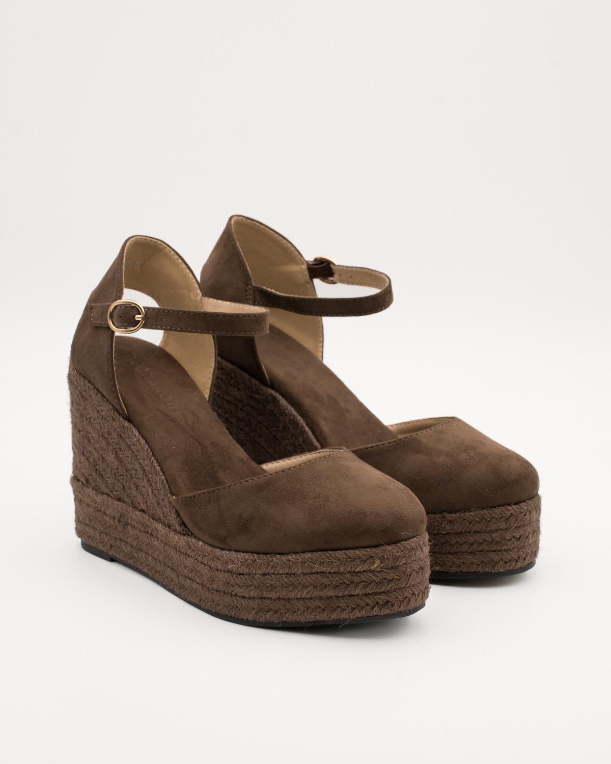 Cuñas de esparto en efecto ante marrón, un básico atemporal que combina estilo y comodidad. Su diseño cerrado en la parte delantera estiliza el pie, mientras que la pulsera ajustable al tobillo aporta sujeción y un toque femenino.