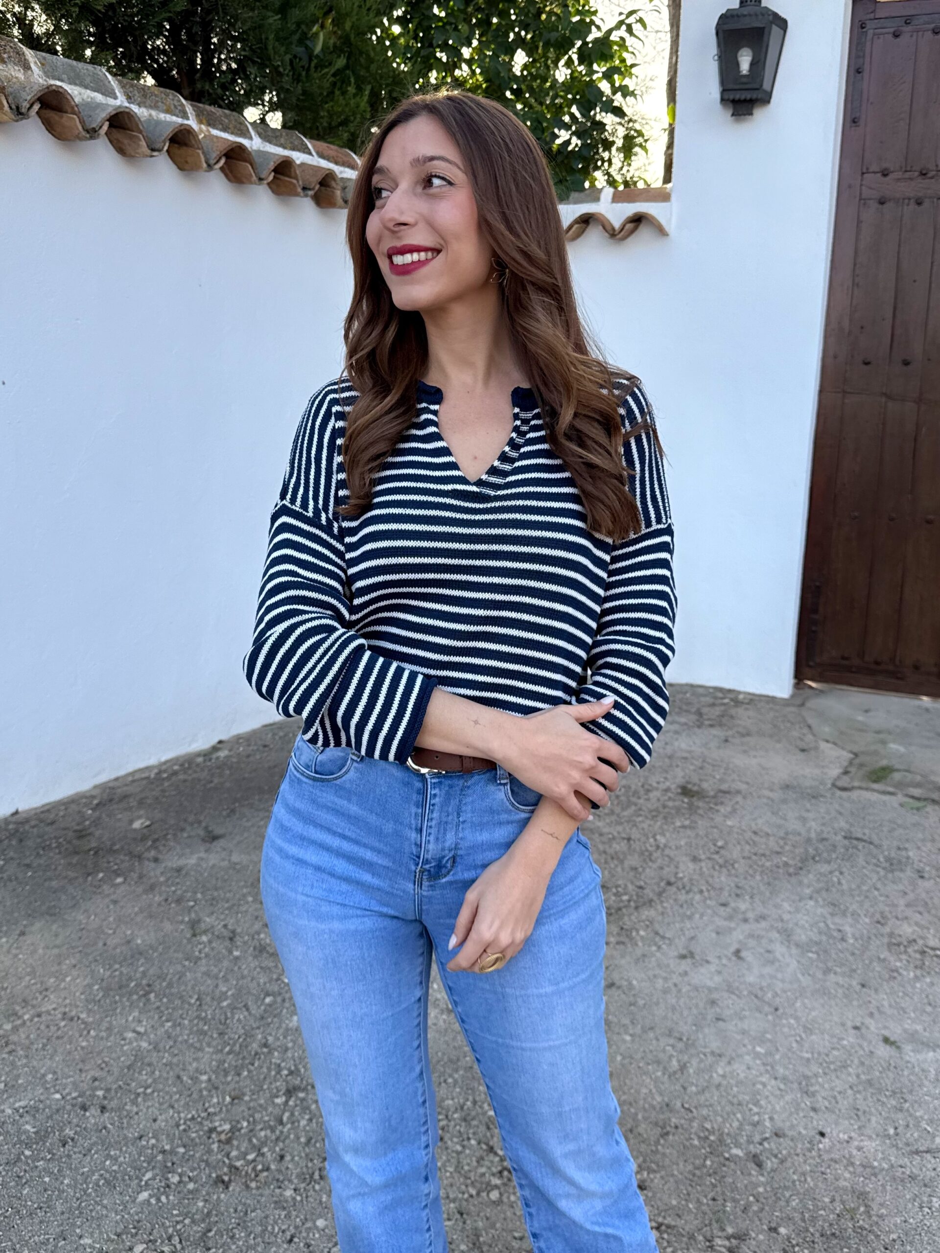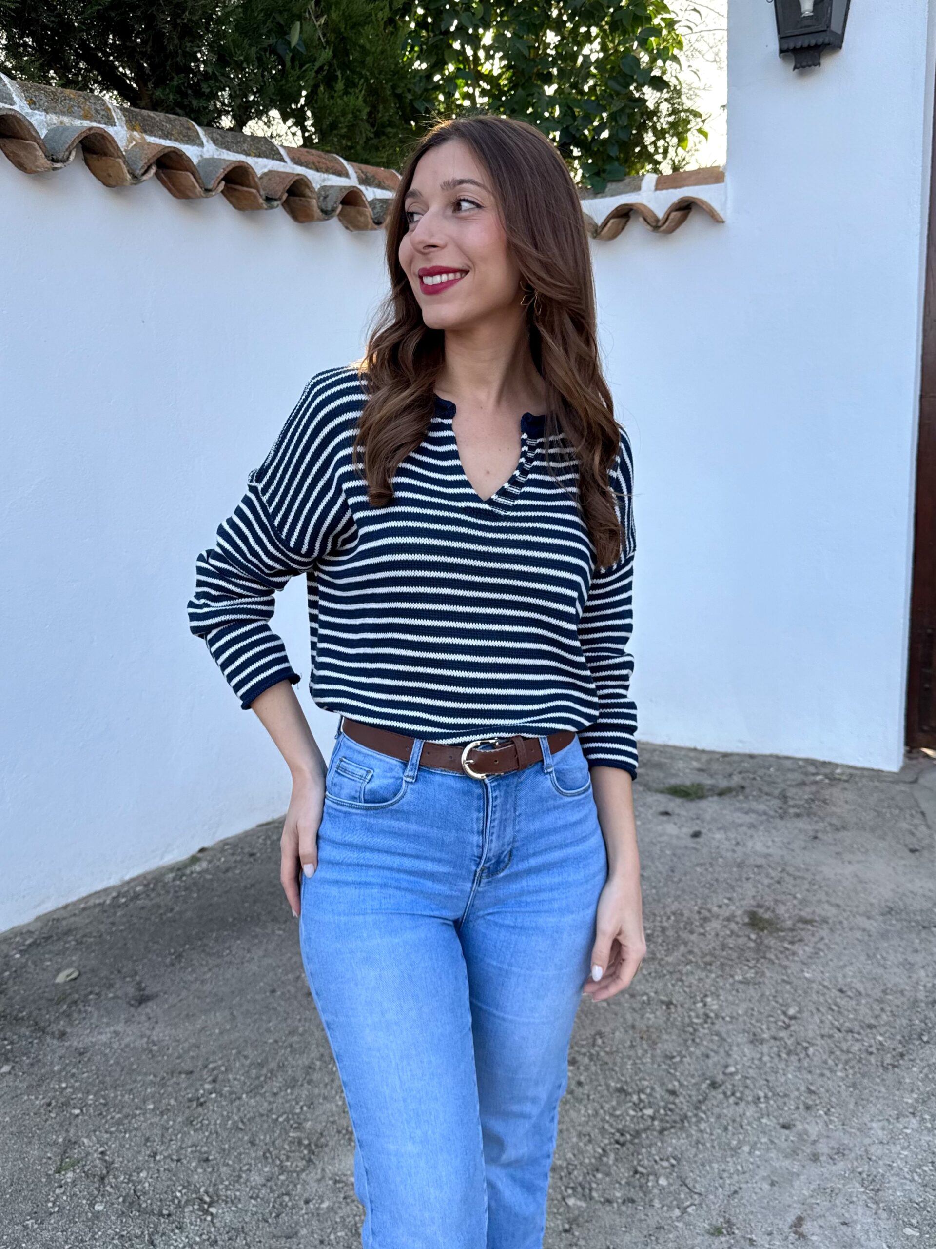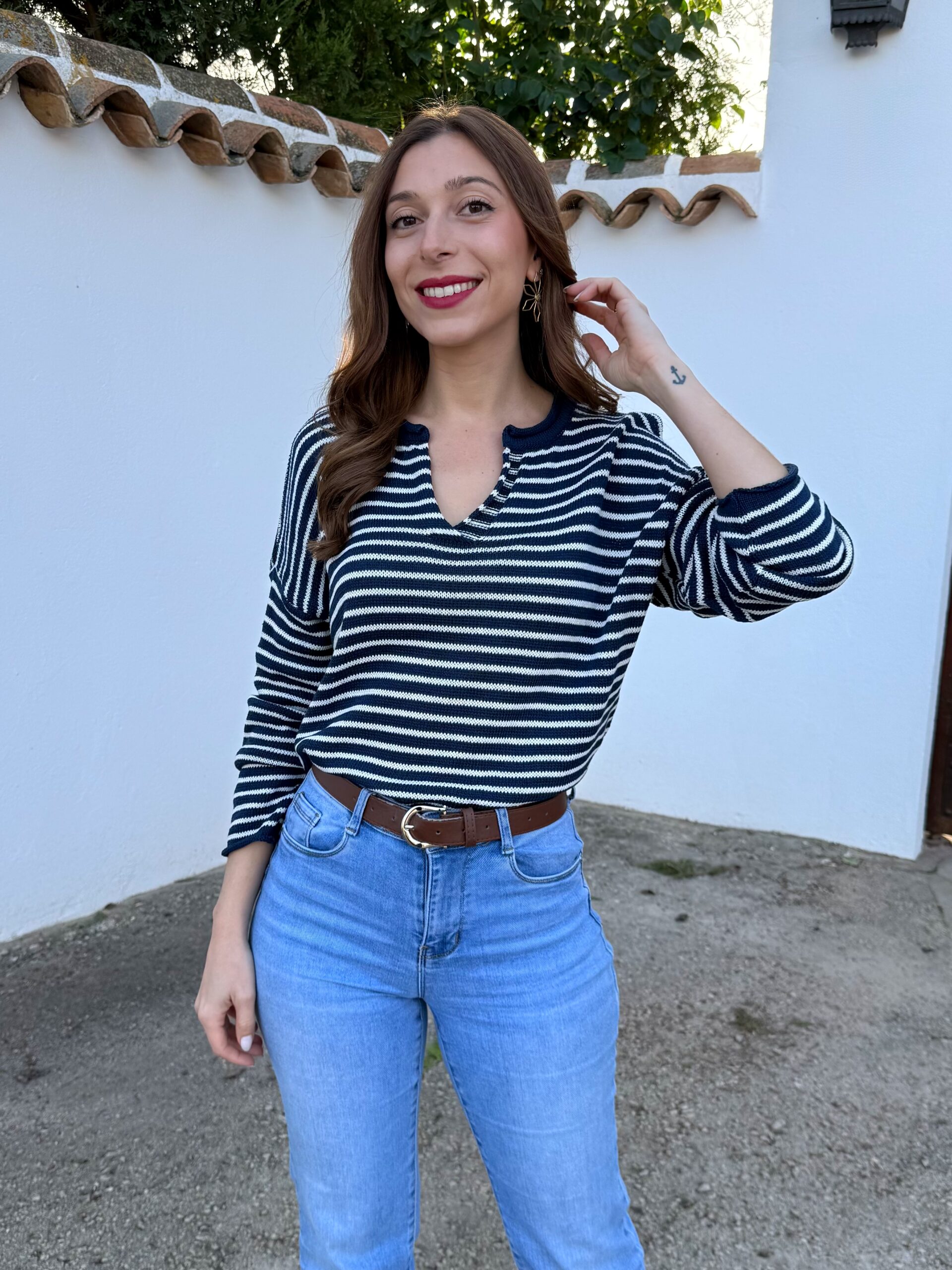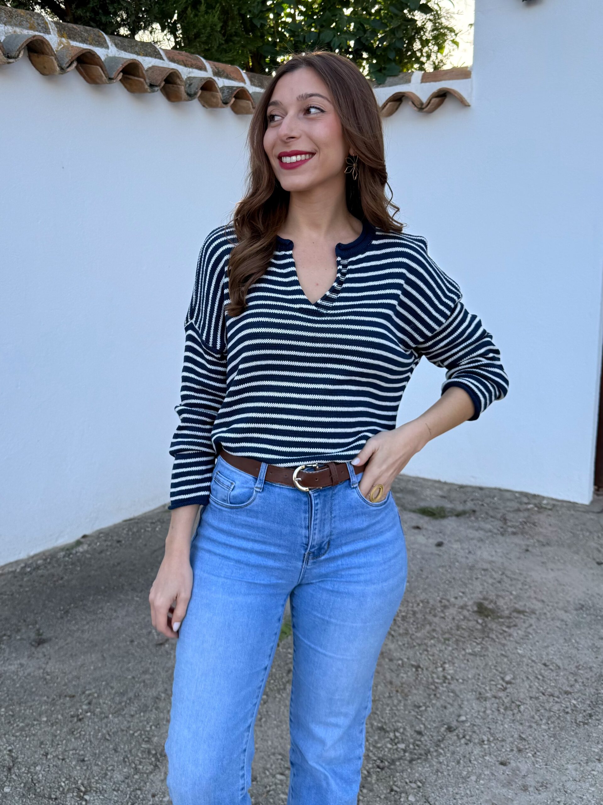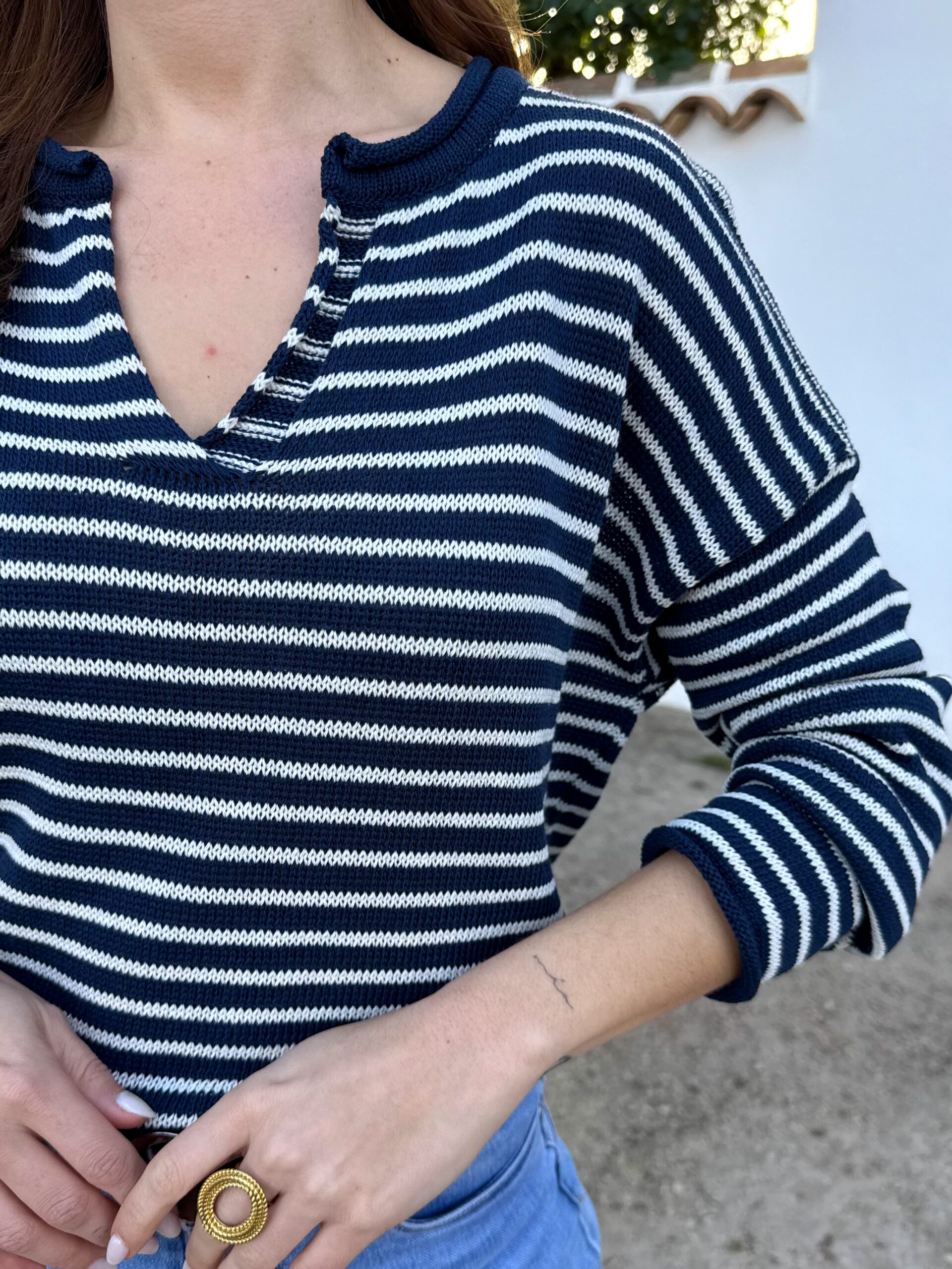 Jersey de punto ligero en tono azul marino con rayita blanca, ideal para dar luz al rostro y elevar cualquier look básico.