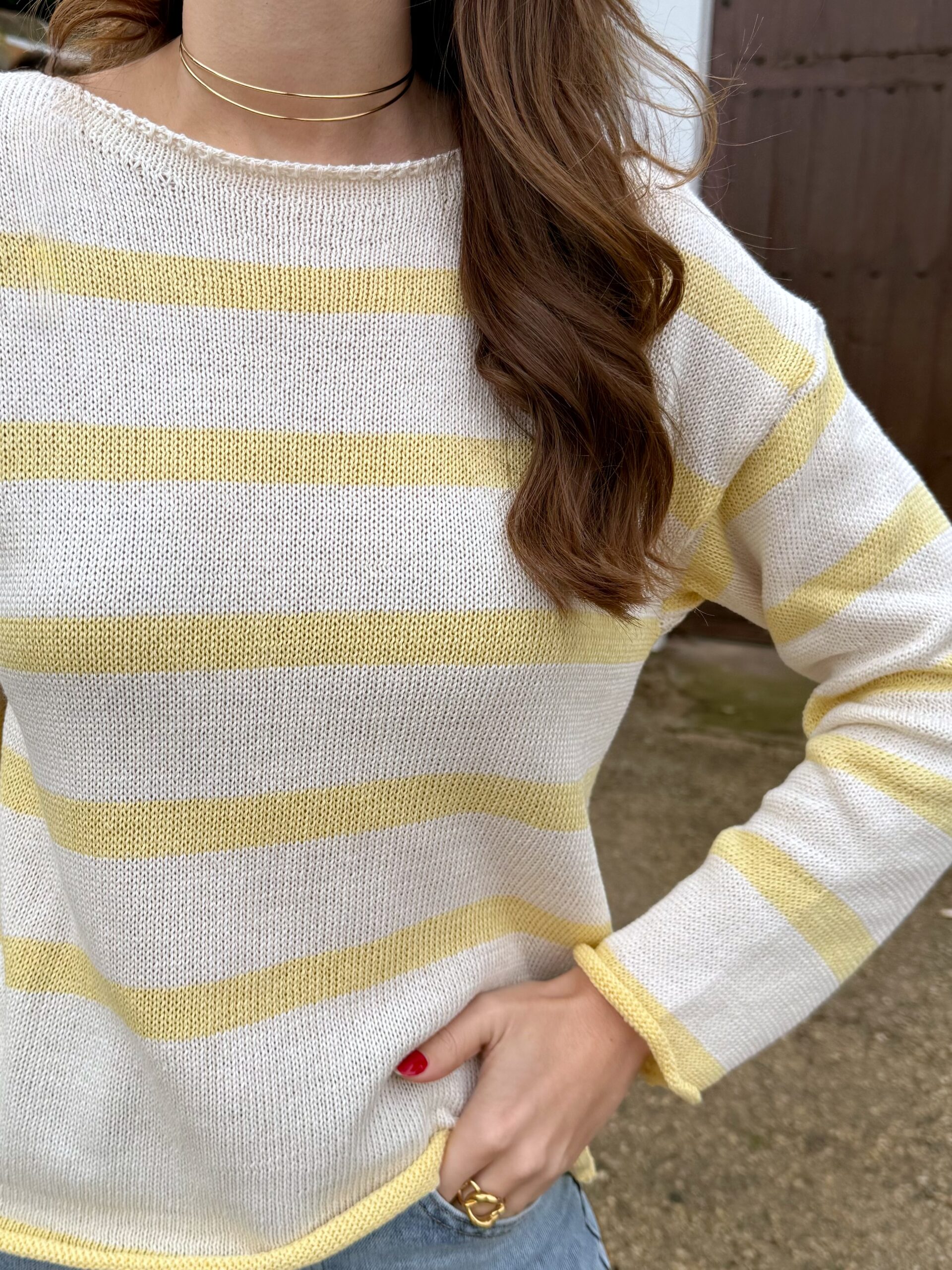 Jersey de hilo fino en tono crudo con rayas horizontales en amarillo pastel que aportan luz y personalidad al look. Su tejido ligero y suave lo convierte en la prenda perfecta para entretiempo, ideal para esos días en los que quieres ir cómoda sin perder estilo.