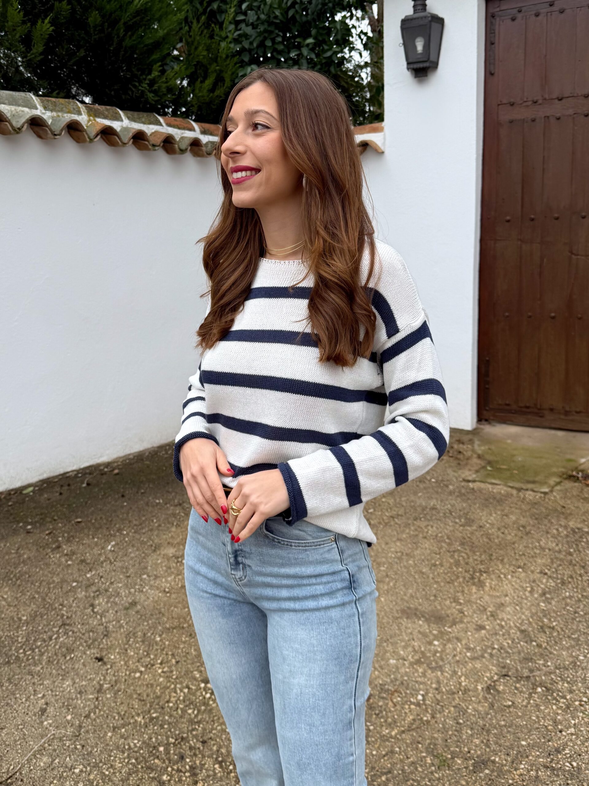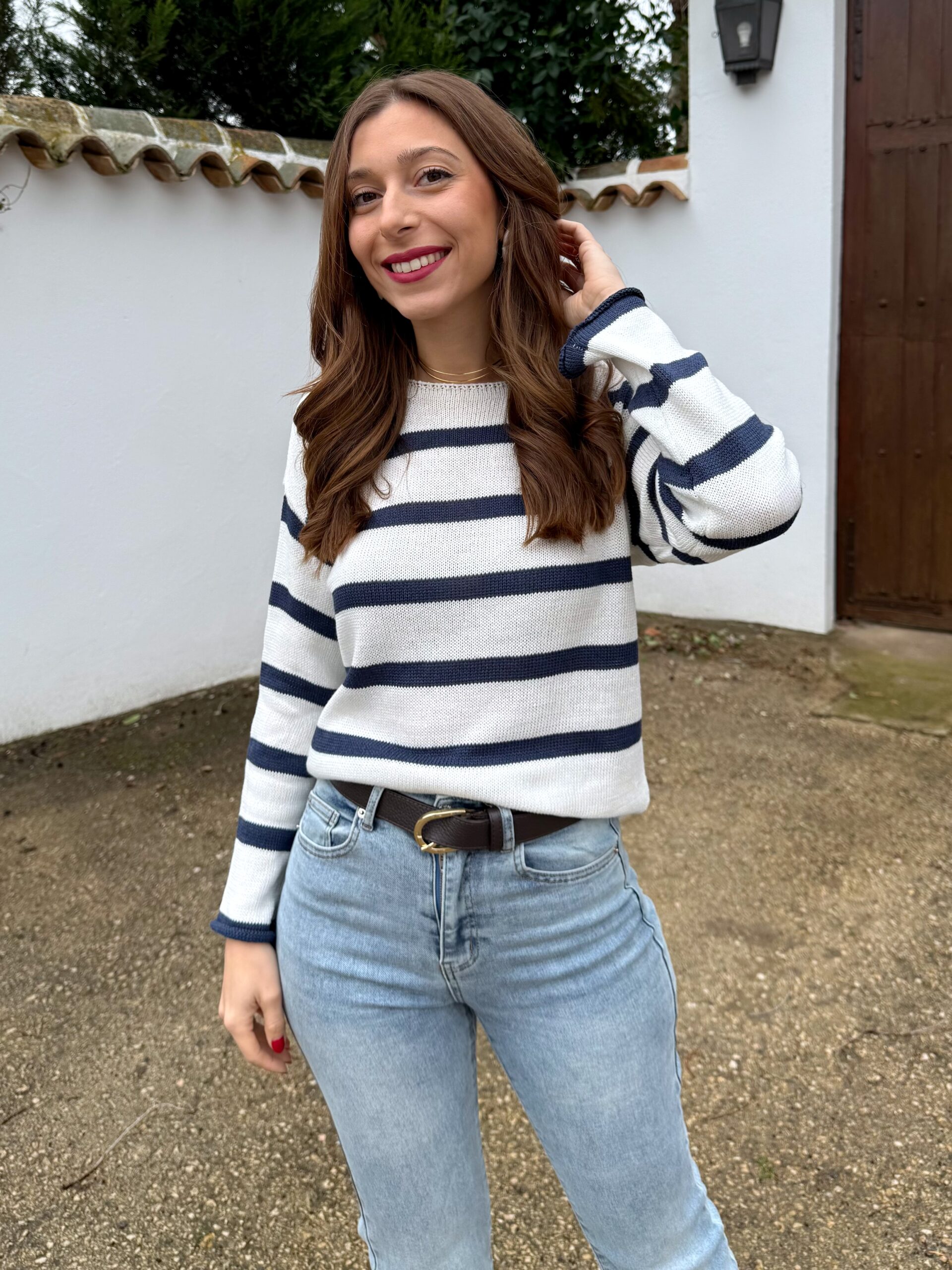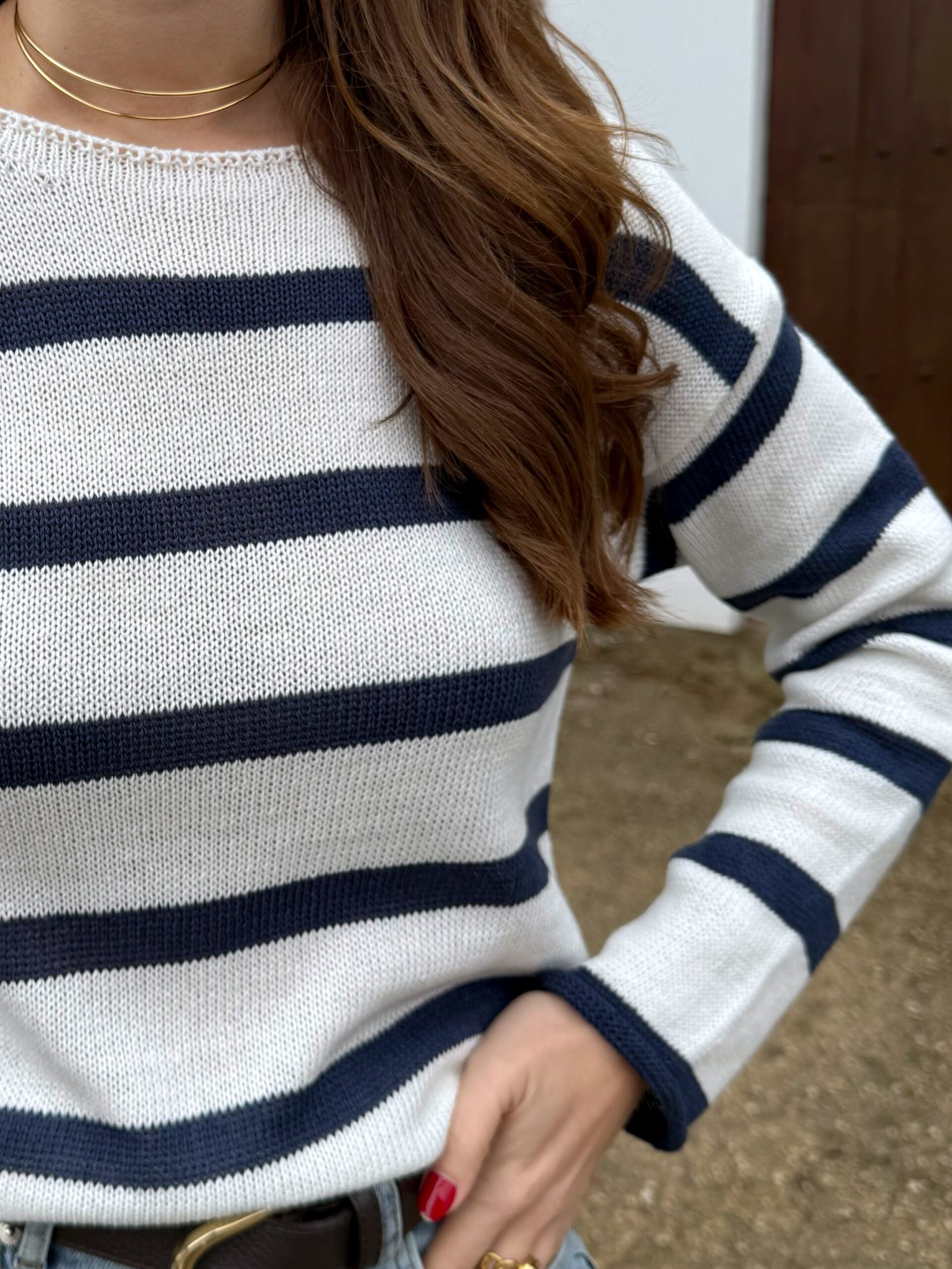 Jersey de hilo fino en tono crudo con rayas horizontales en azul marino que aportan luz y personalidad al look. Su tejido ligero y suave lo convierte en la prenda perfecta para entretiempo, ideal para esos días en los que quieres ir cómoda sin perder estilo.
