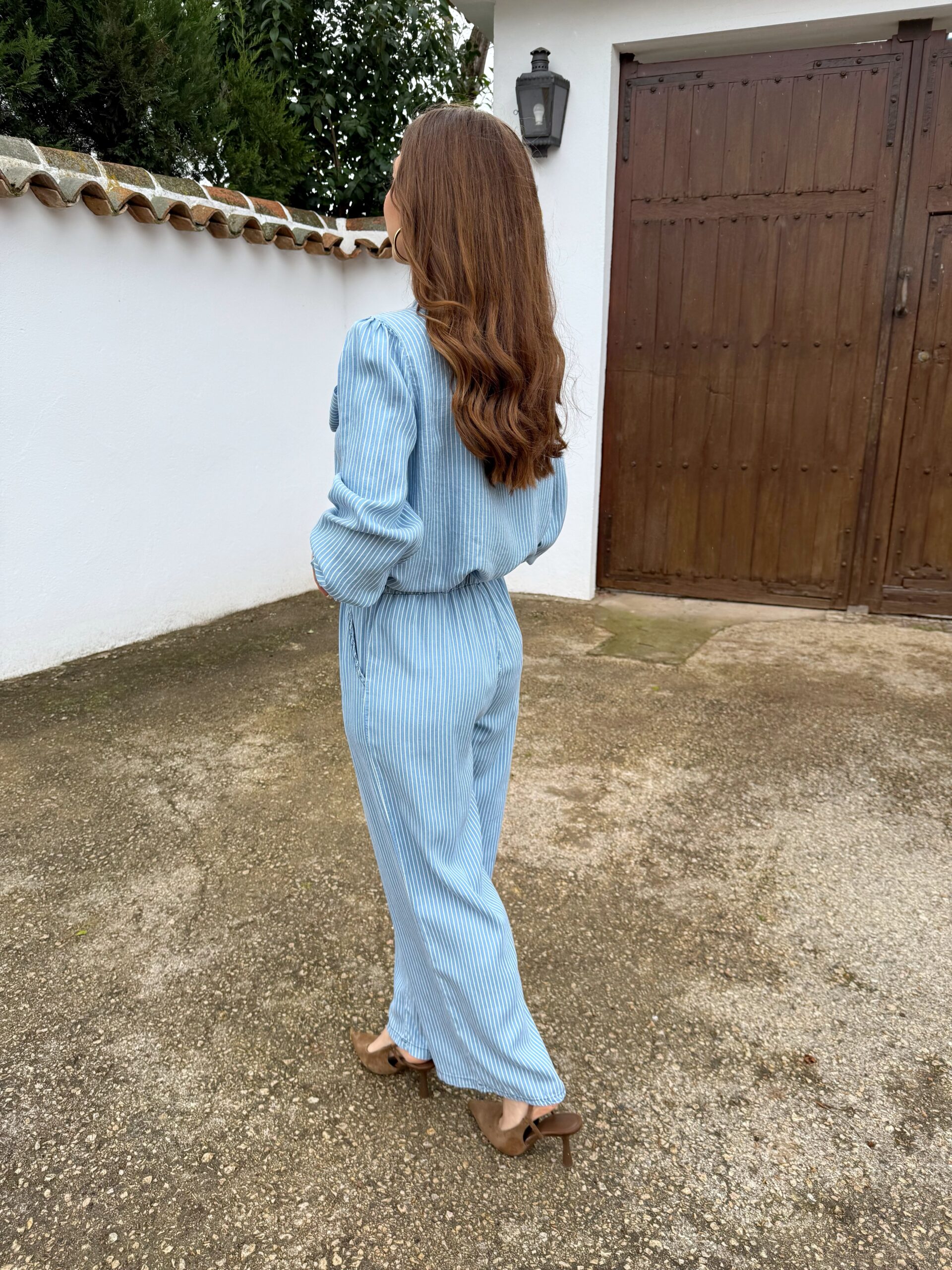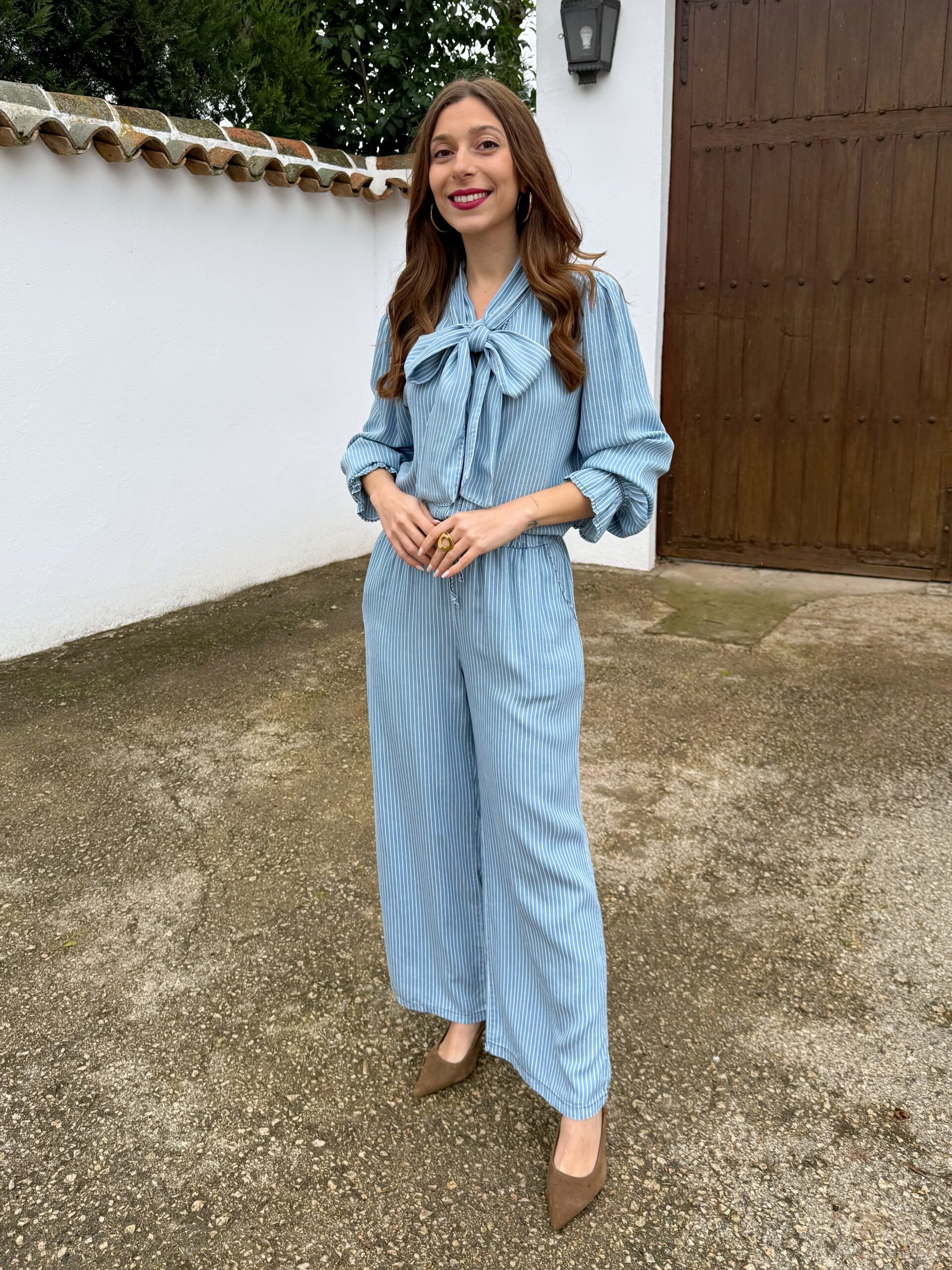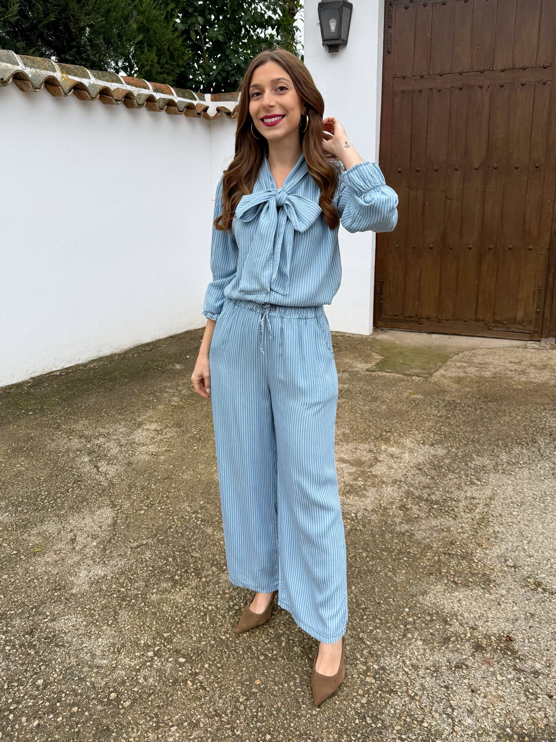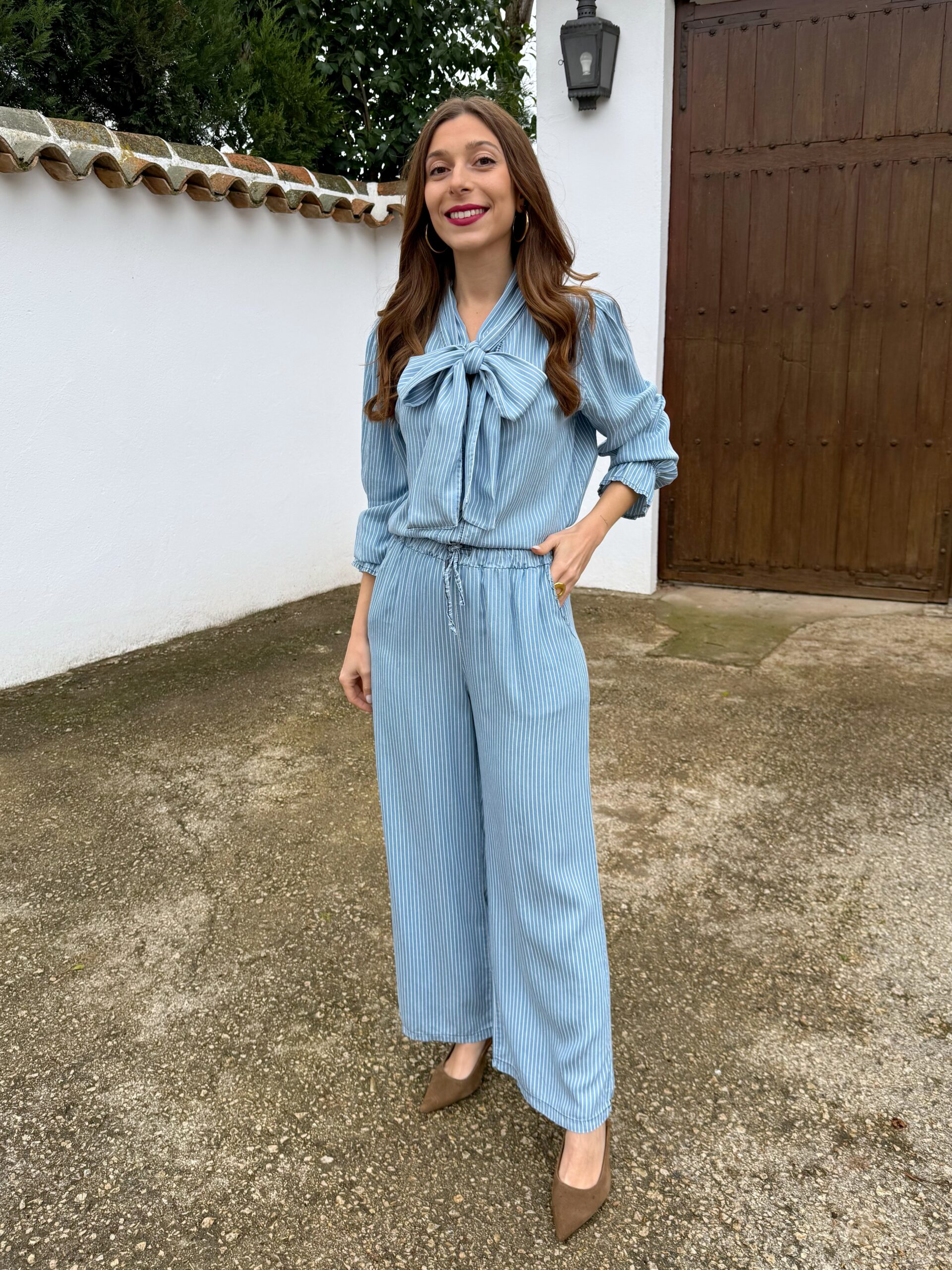 Un pantalón elegante y muy favorecedor que estiliza la silueta gracias a su diseño de rayas verticales en tono denim claro con líneas blancas. Un patrón clásico renovado que aporta luz y frescura al look.