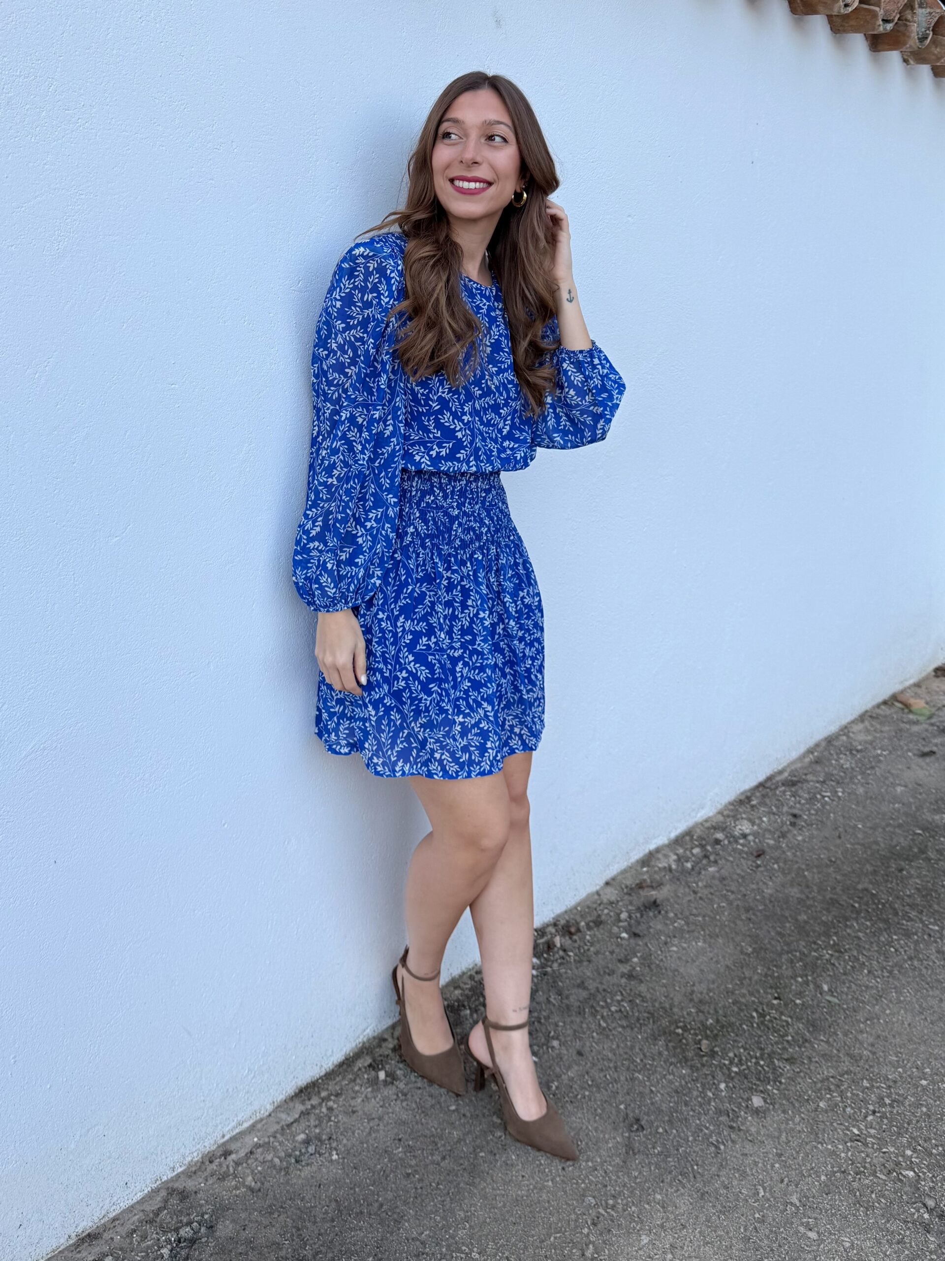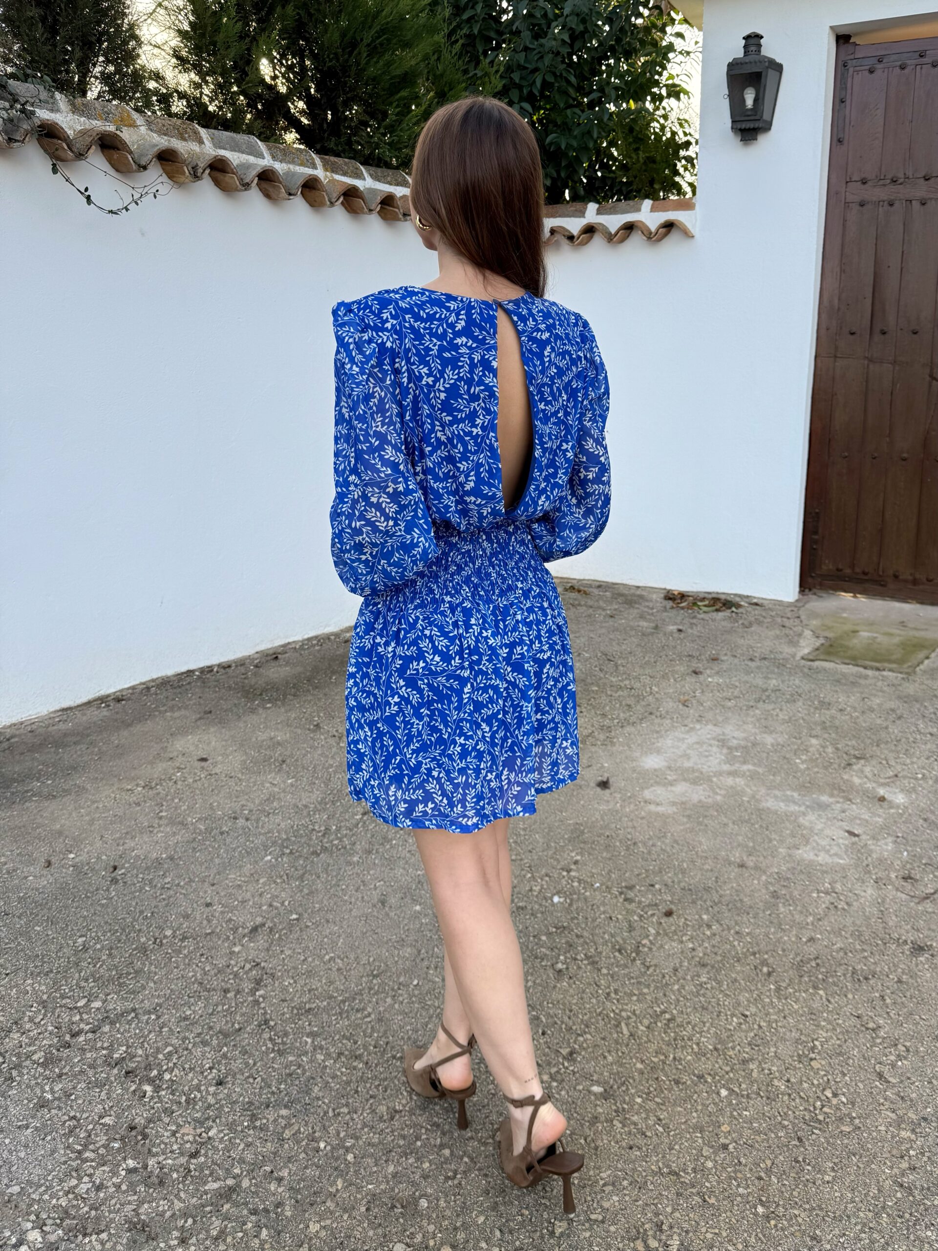 Vestido corto en tono azul intenso con delicado estampado floral en contraste.