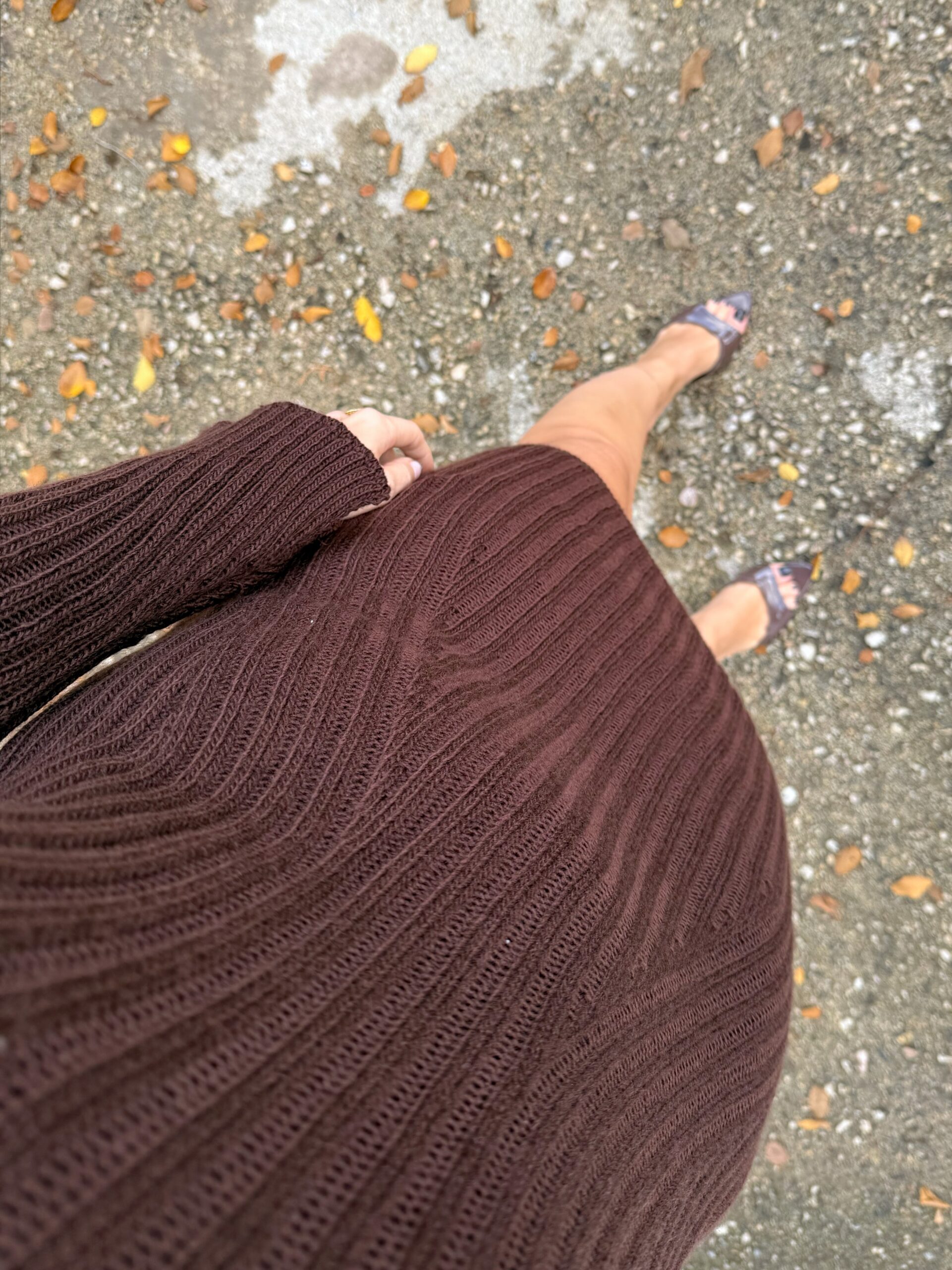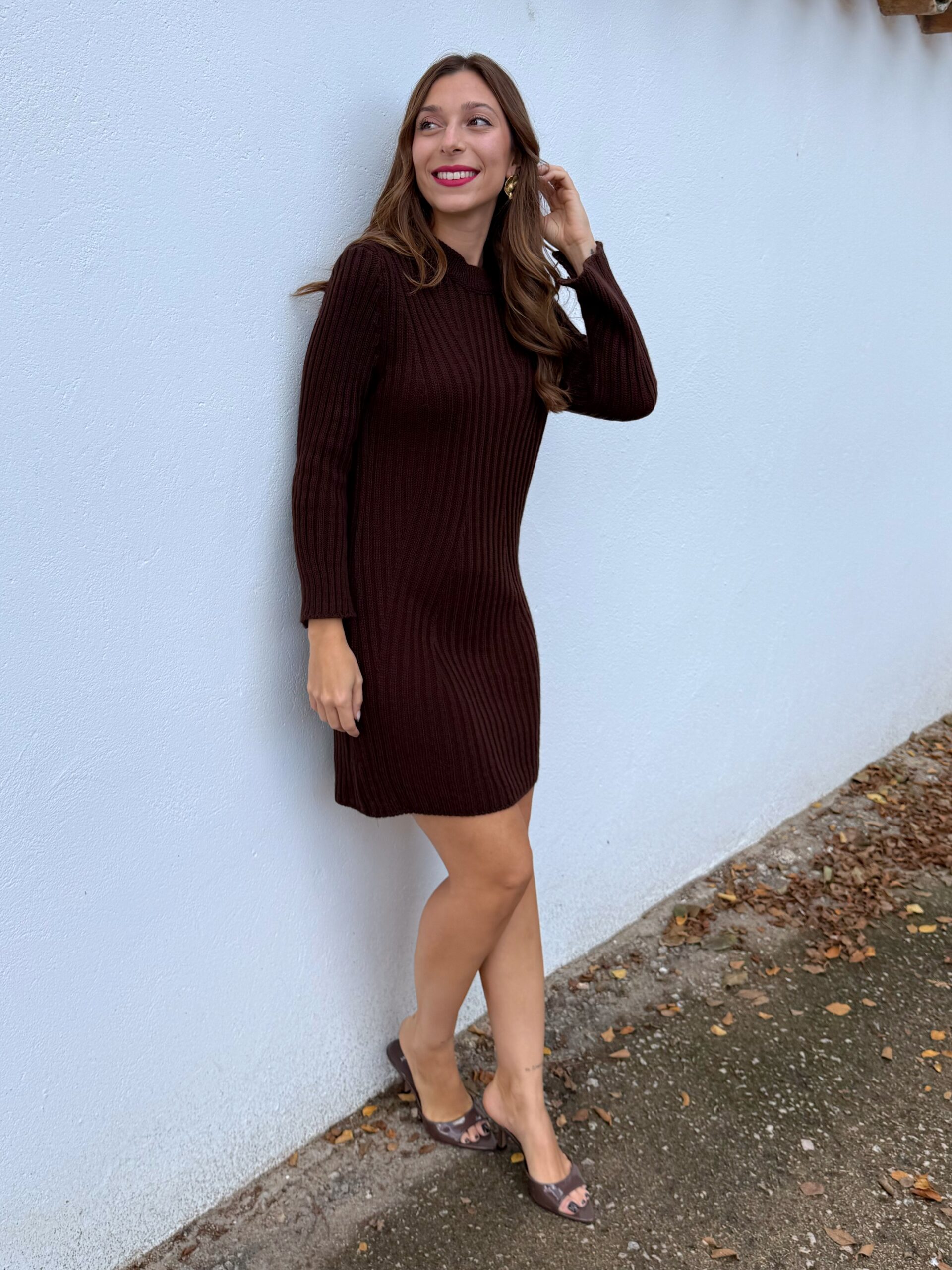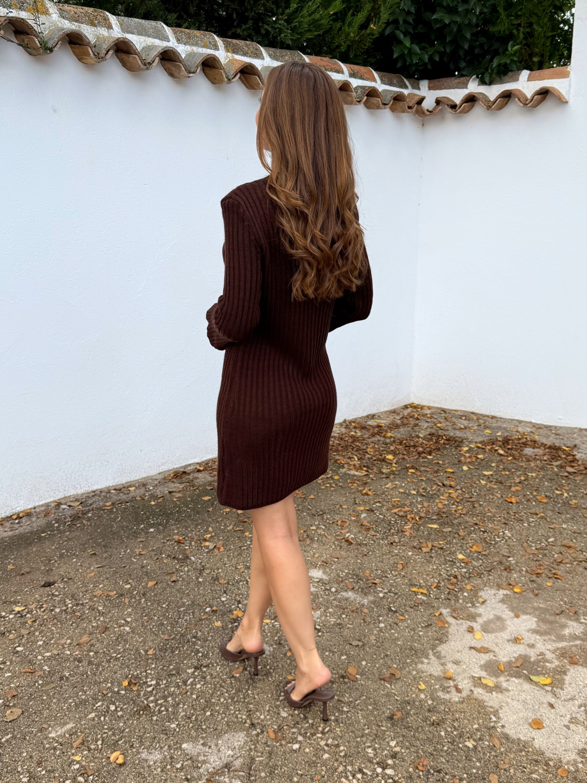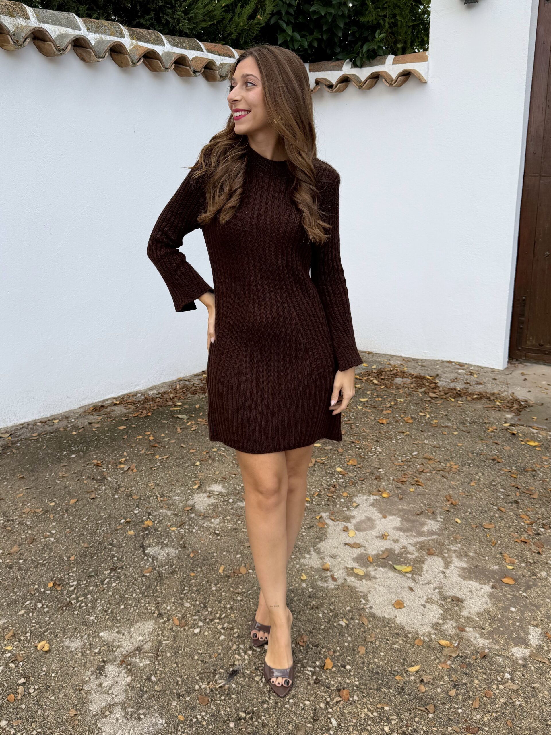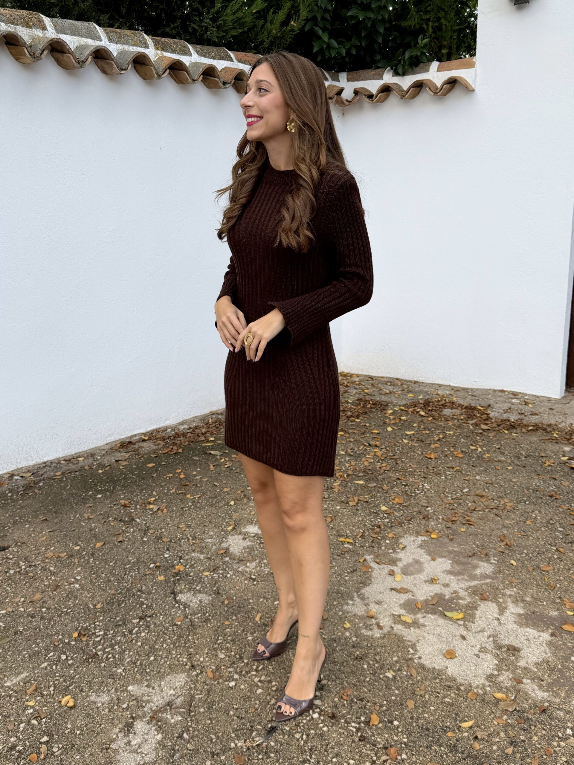 El Vestido Mini Punto Marrón es esa prenda que une lo cómodo con lo irresistible. Confeccionado en un tejido de punto suave y elástico, abraza la figura con naturalidad sin marcar en exceso, creando una silueta femenina y estilizada.