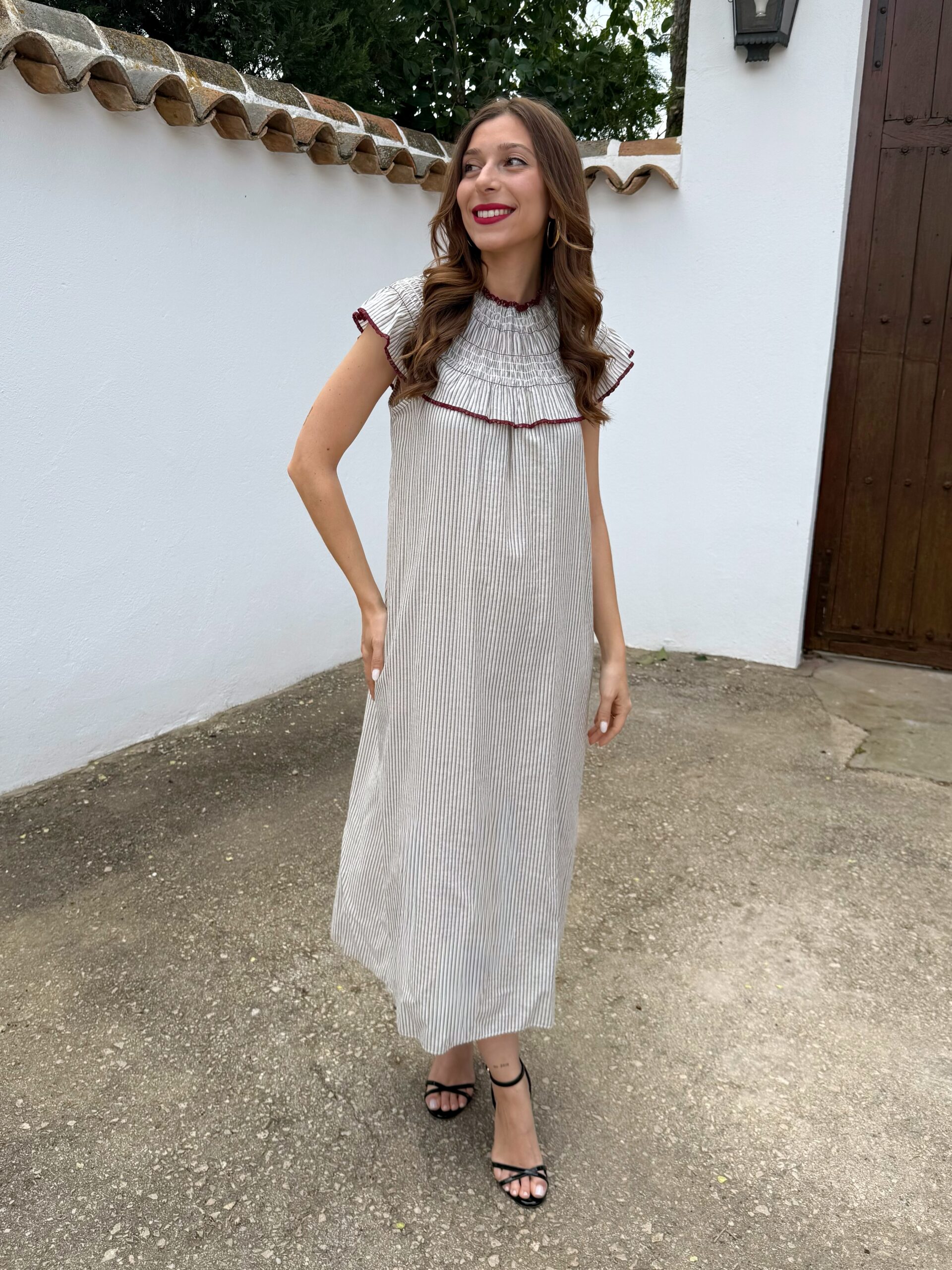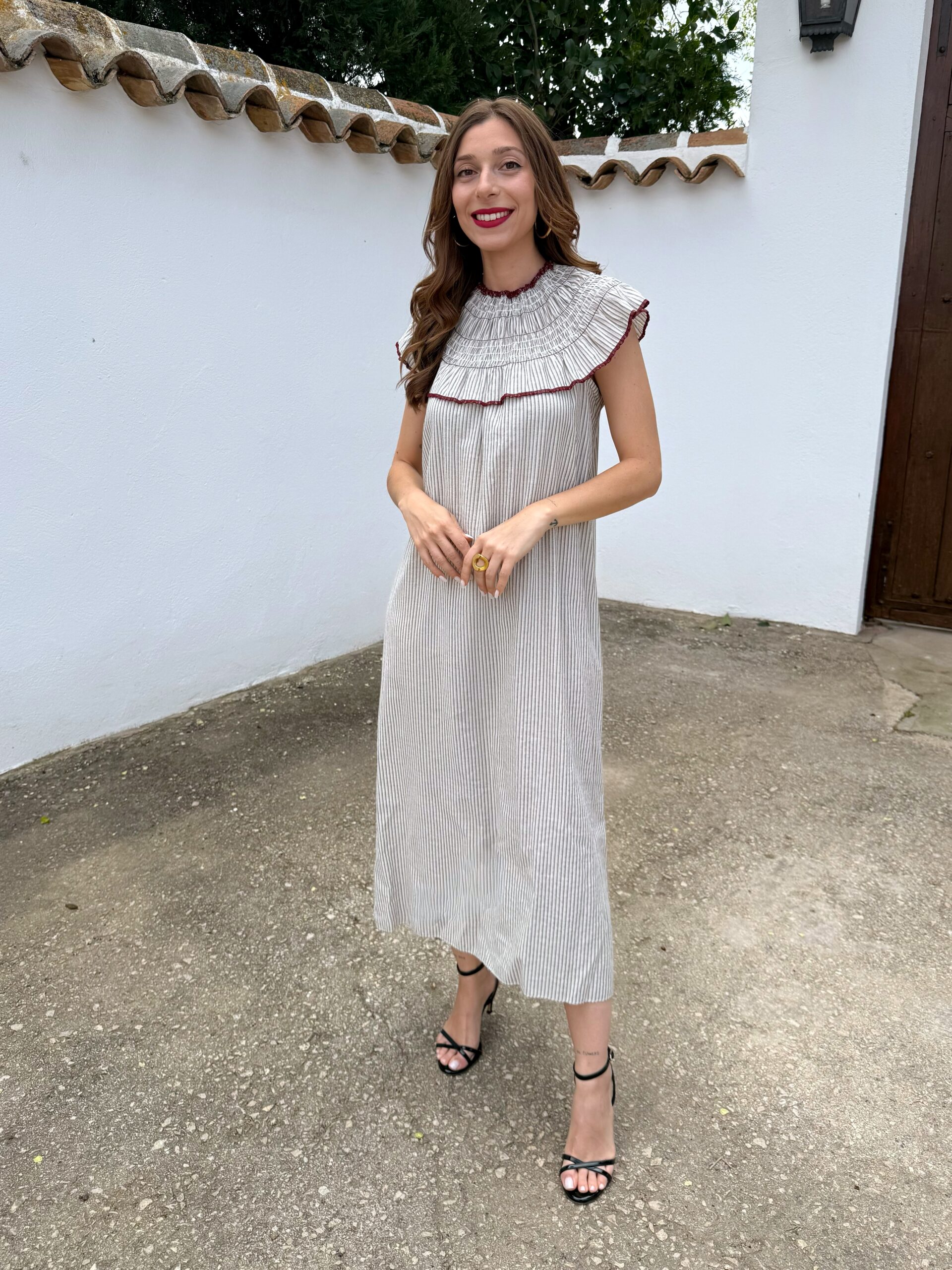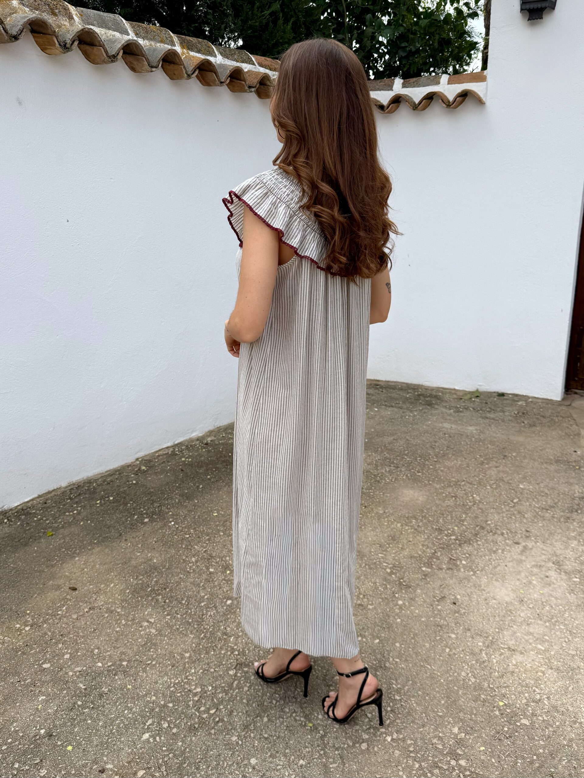 Su corte fluido y las rayitas finas estilizan un montón, mientras que el cuello fruncido con volante amplio y detalle en contraste burdeos le da ese toque especial que marca la diferencia.