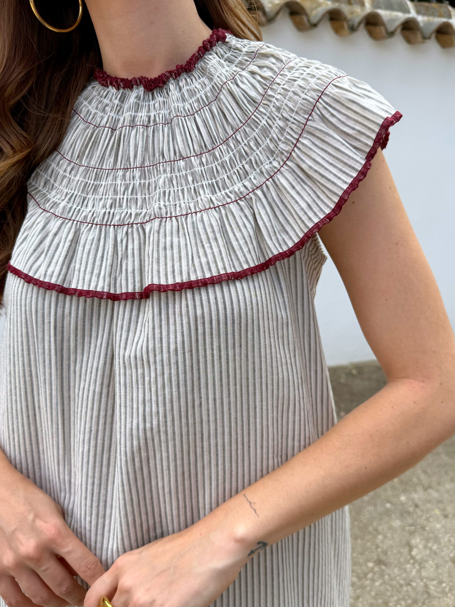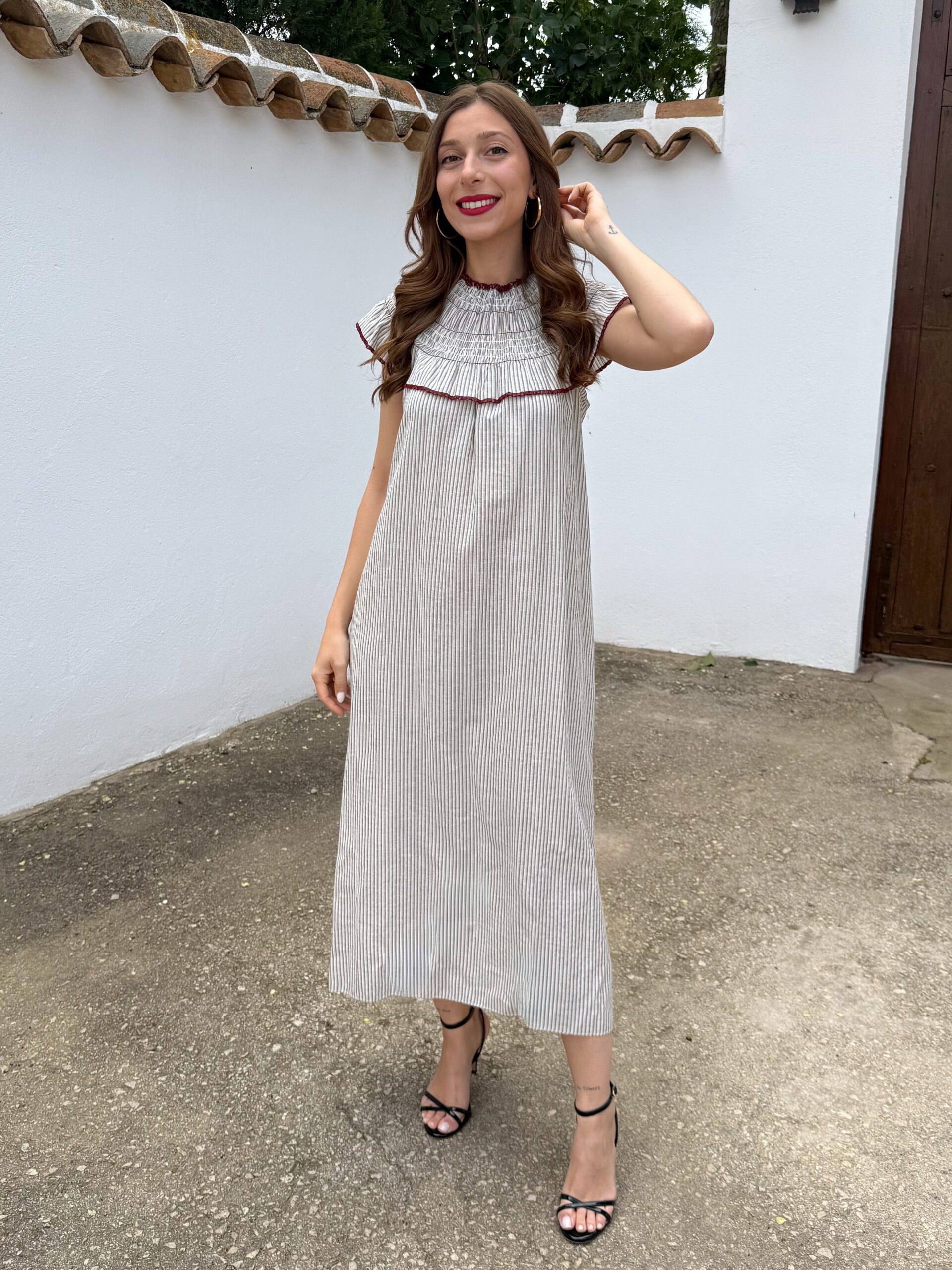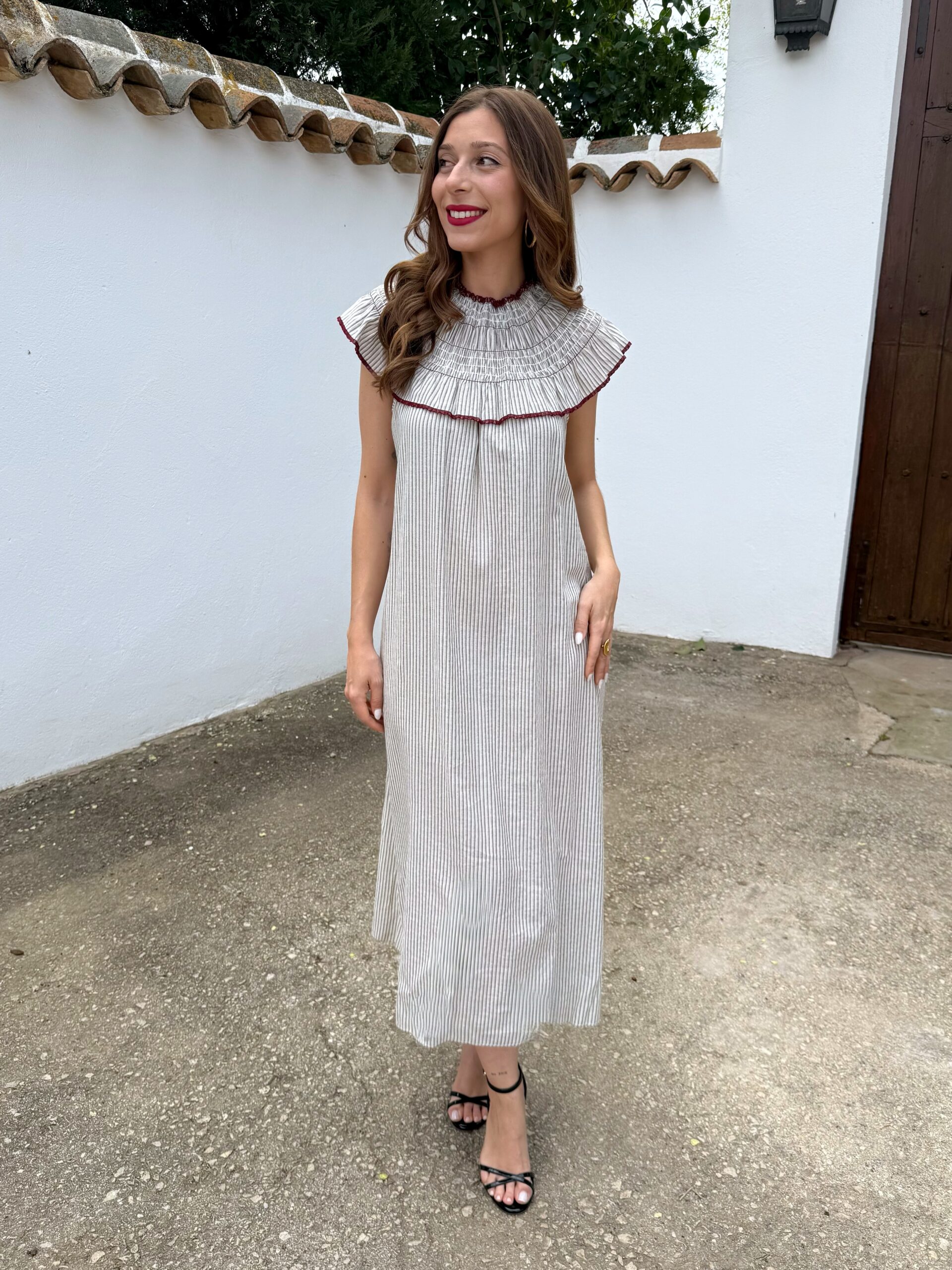 Su corte fluido y las rayitas finas estilizan un montón, mientras que el cuello fruncido con volante amplio y detalle en contraste burdeos le da ese toque especial que marca la diferencia.