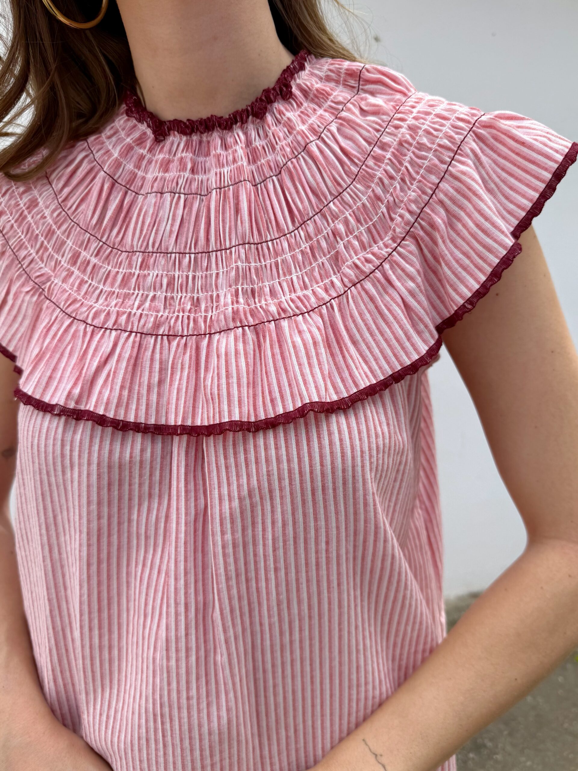 Su corte fluido y las rayitas finas estilizan un montón, mientras que el cuello fruncido con volante amplio y detalle en contraste le da ese toque especial que marca la diferencia.